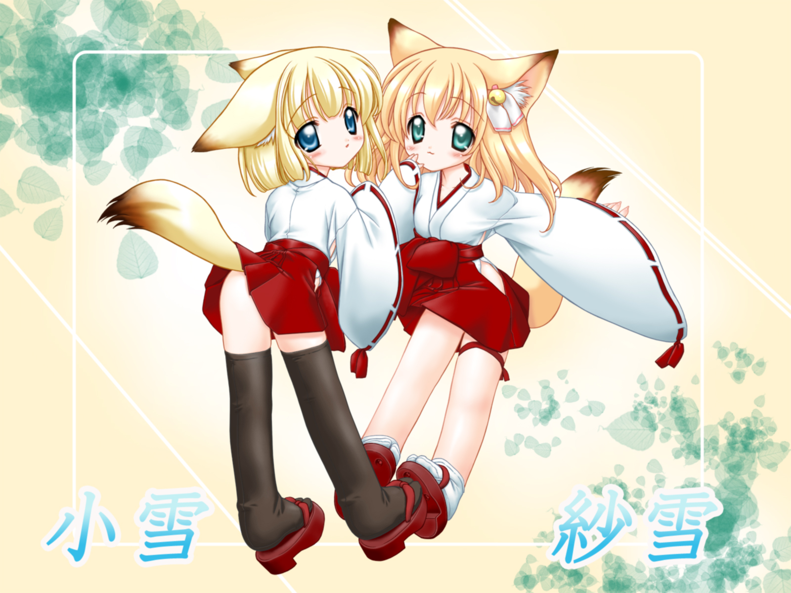 2girlsadapted uniformanimal earsbellblonde hairfox earsfox tailhakamahakama skirtjapanese clothesmikomultiple girlsno pantiesred hakamaskirttabitailthighhighs