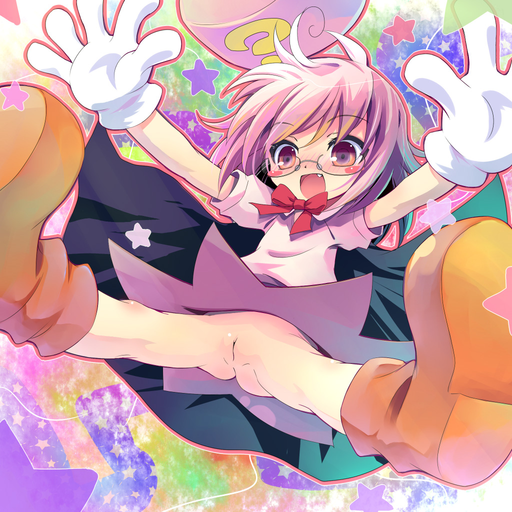 1boy1girlblushbottomlessfangfemale focusglasseshatlolino pantiespink hairpink hatpussyshort hairsolospread legsuncensored