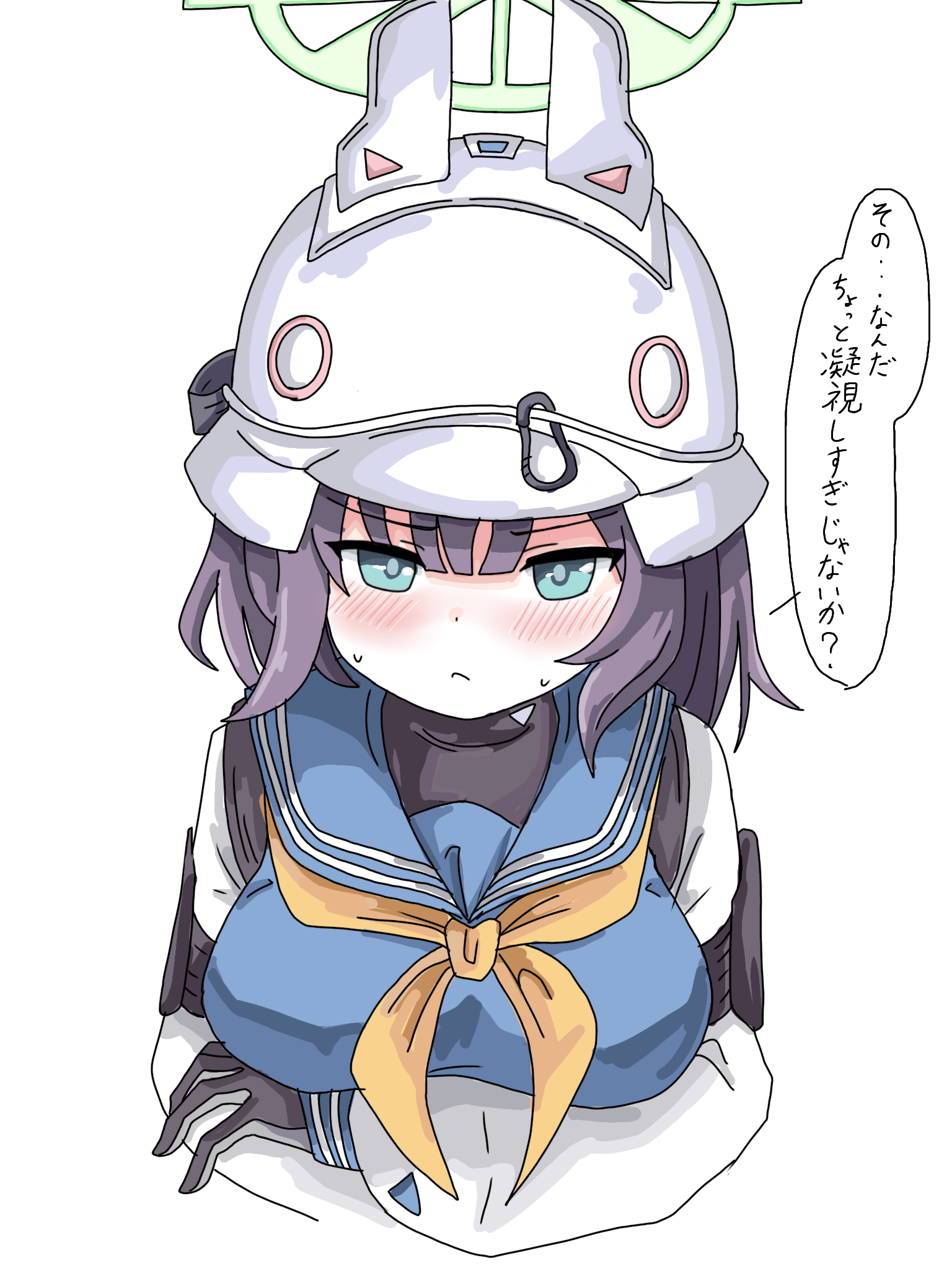1girlanimal earsaqua eyesblack glovesblue sailor collarblue shirtblushbreastsclosed mouthcombat helmetcropped torsofake animal earsfrownglovesgreen halohalohelmetlarge breastslooking at viewermedium hairneckerchiefpurple hairrabbit earssailor collarshirtsimple backgroundsolosweattwo-tone shirtwhite backgroundwhite shirtyellow neckerchief