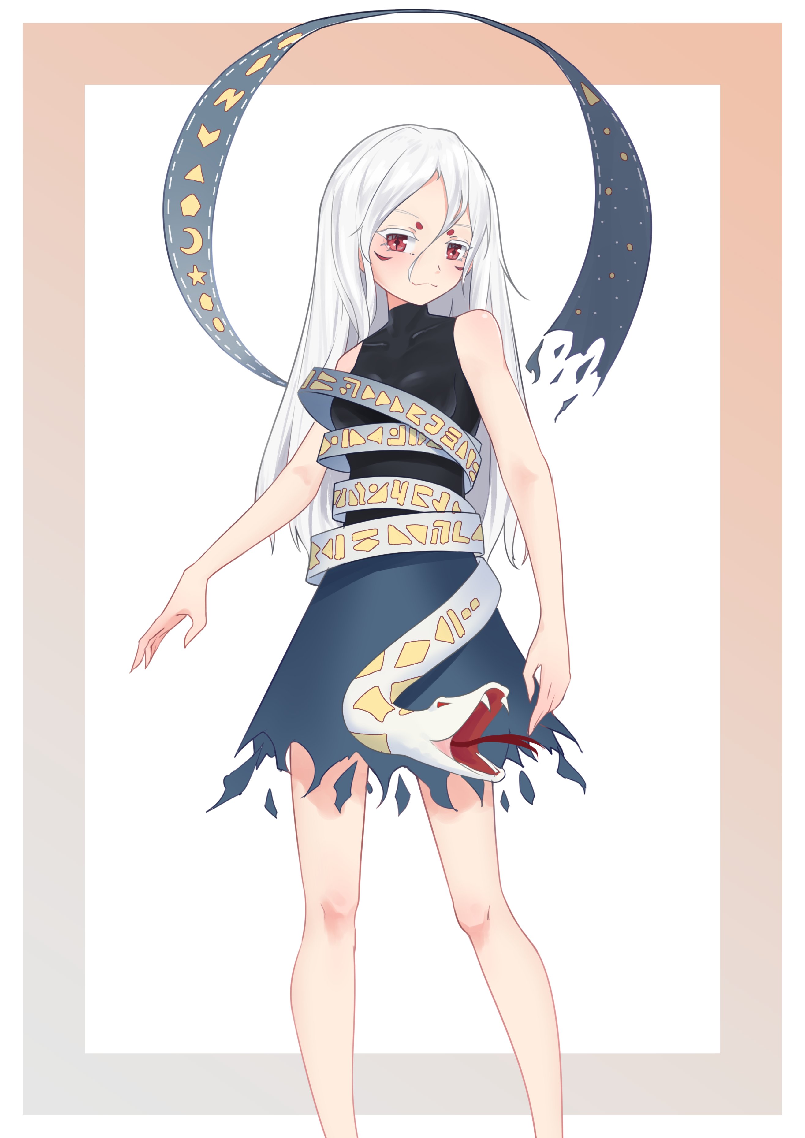 1girlblack shirtfacial markfangshair between eyeshalternecklong hairlooking at viewerred eyesribbonshirtskirtsleevelessslit pupilssnakesolostandingtonguetongue outtorn clothestorn skirtwhite hairwhite snake
