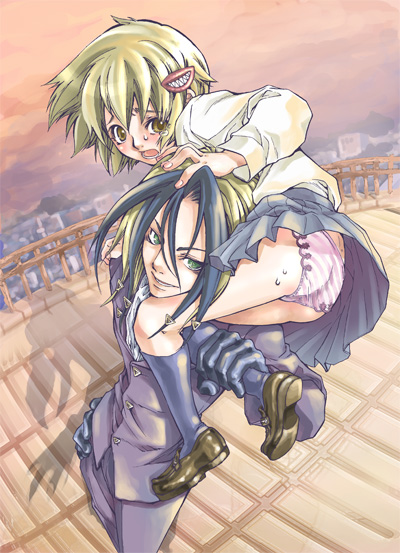 00s1boy1girlblonde hairblushcarryingcolored bangscouplegreen eyesgrinheteropantiesskirtsmilestriped clothesstriped pantiesunderwearyellow eyes