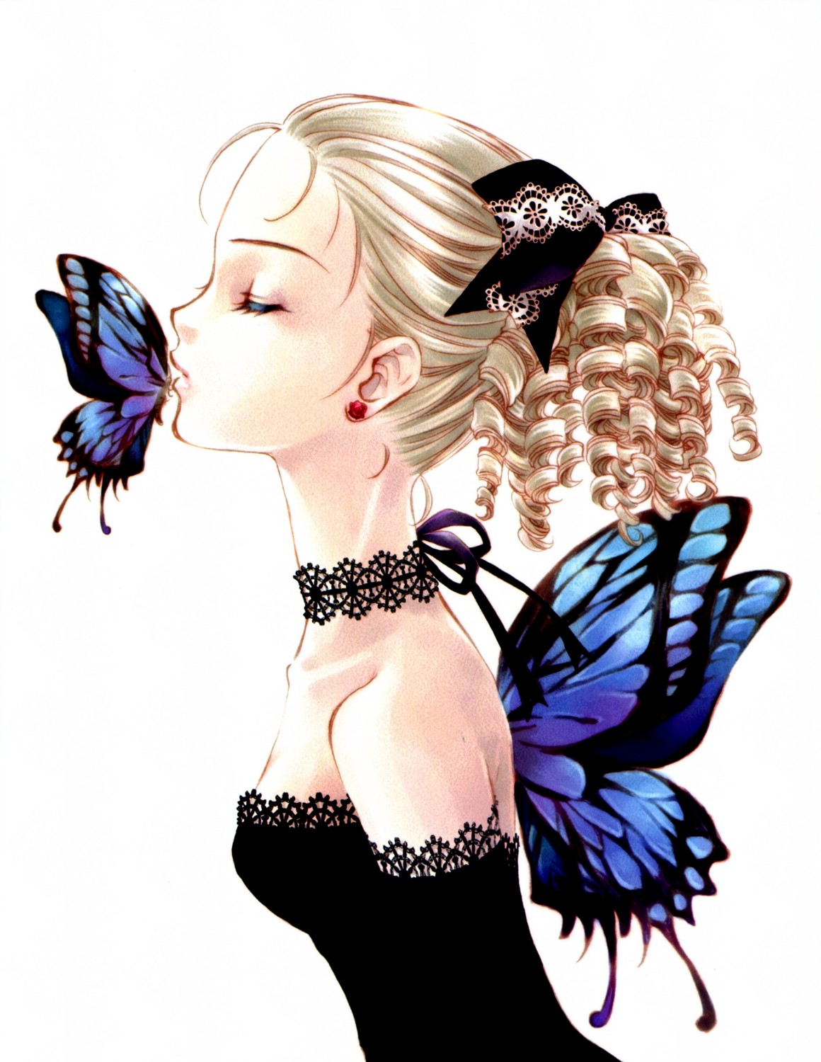 1girlbare shouldersblack dressblonde hairbowbugbutterflybutterfly wingschokerclosed eyescurly hairdressearringsfemale focusflower earringsfrom sidehair bowinsectinsect wingsjewelrylacelace trimlace-trimmed dressponytailprofileribbonringletssimple backgroundsoloupper bodywhite backgroundwings