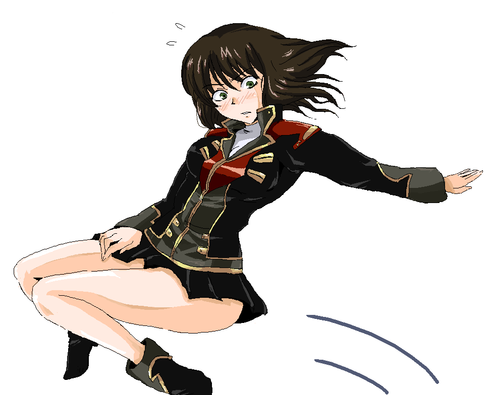 :o1girlankle bootsblack hairblushbootsfemale focusfull bodyjumpinglong sleevesminiskirtoekakioutstretched armparted lipspleated skirtred eyesschool uniformserafukusimple backgroundskirtsolowhite background