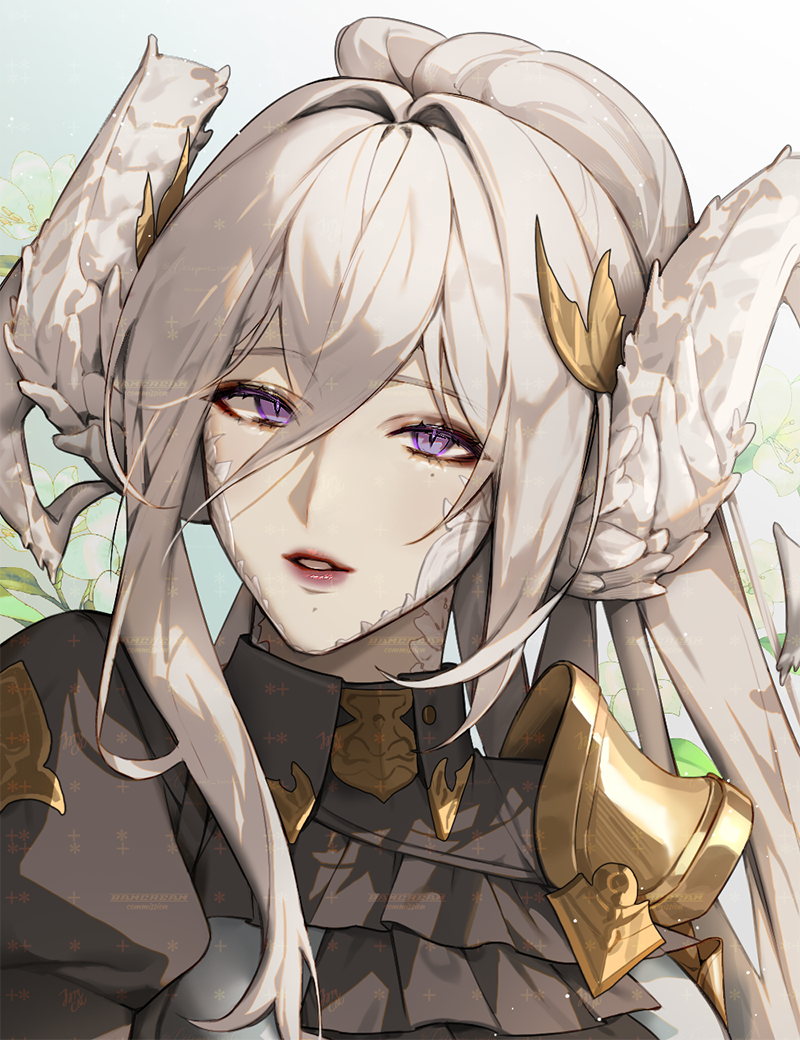 1girlblack jackethair between eyesjacketlong hairlooking at viewerparted lipsponytailportraitpurple eyessolowhite hair