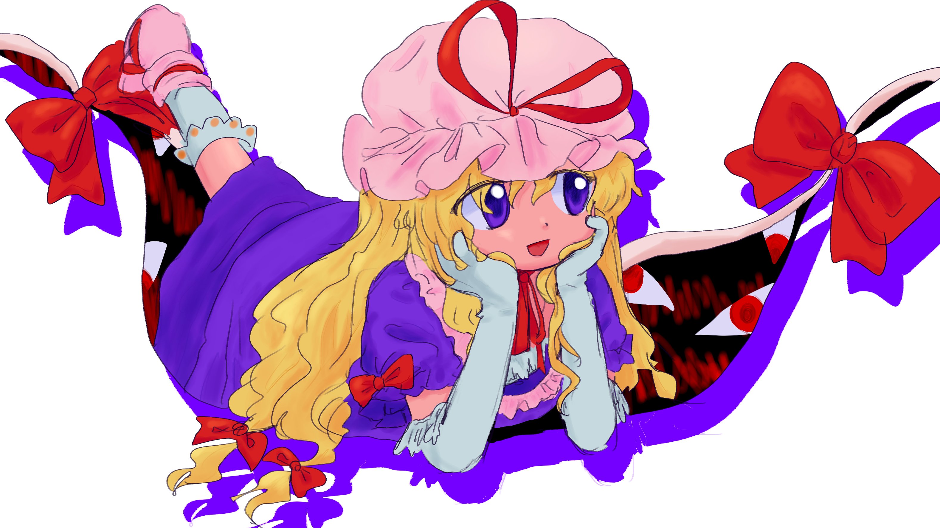 1girlblonde hairchokerdresselbow glovesfrillsgap (touhou)gloveshair between eyeshair ribbonhathead restlyingmob capon stomachopen mouthpink shoespurple dresspurple eyesred eyesribbonribbon chokershoesshort sleevesskyshrimp830smilesockssolowhite backgroundwhite gloveswhite socks