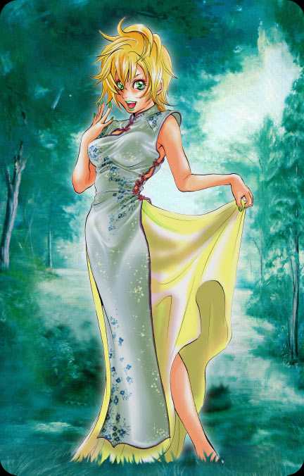 1girlblonde hairchina dresschinese clotheschitose (loveu2606strip)clothes liftdresseyeshadowfemale focusforestgreen eyeslipstickmakeupnatureopen mouthskirtskirt holdskirt liftsolo