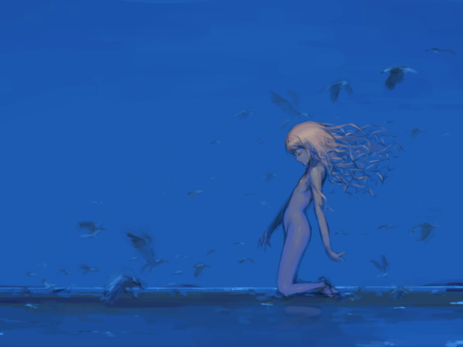 1girlbarefootbirdblonde hairblue themeclosed eyesfeathersfeetfemale focusflat chestfloating hairkneelinglolilong hairnightnudesolovery long hairwaterwavy hair