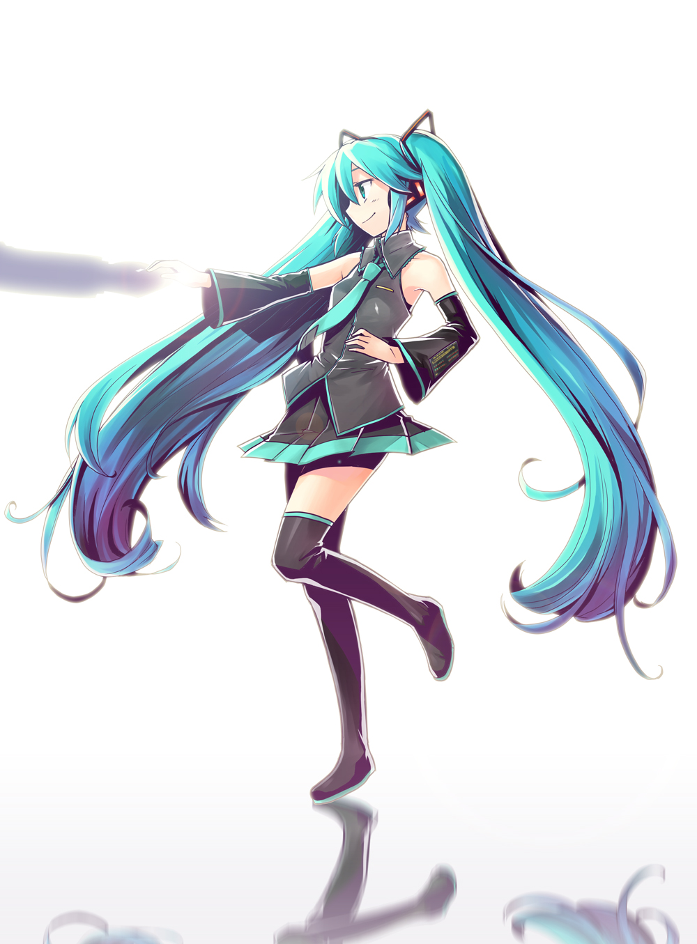 aqua eyesaqua hairdetached sleeveslong hairnecktiereflectionskirtsolothighhighstwintailszettai ryouiki