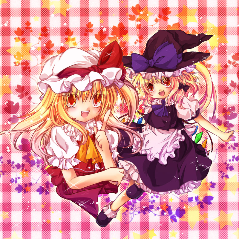 2girlsblonde hairchildcosplaycostume switchfemale focusflandre scarlet (cosplay)hatkirisame marisa (cosplay)long hairmob capmultiple girlsribbonwings