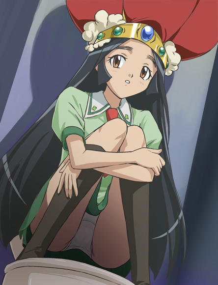 00s1girlblack hairblushbrown eyescrownfemale focushathugging own legsjewelrykneehighslong hairnecktieorange eyespantiespantyshotred crownschool uniformserafukuskirtsockssolosquattingunderwearvery long hairwhite panties