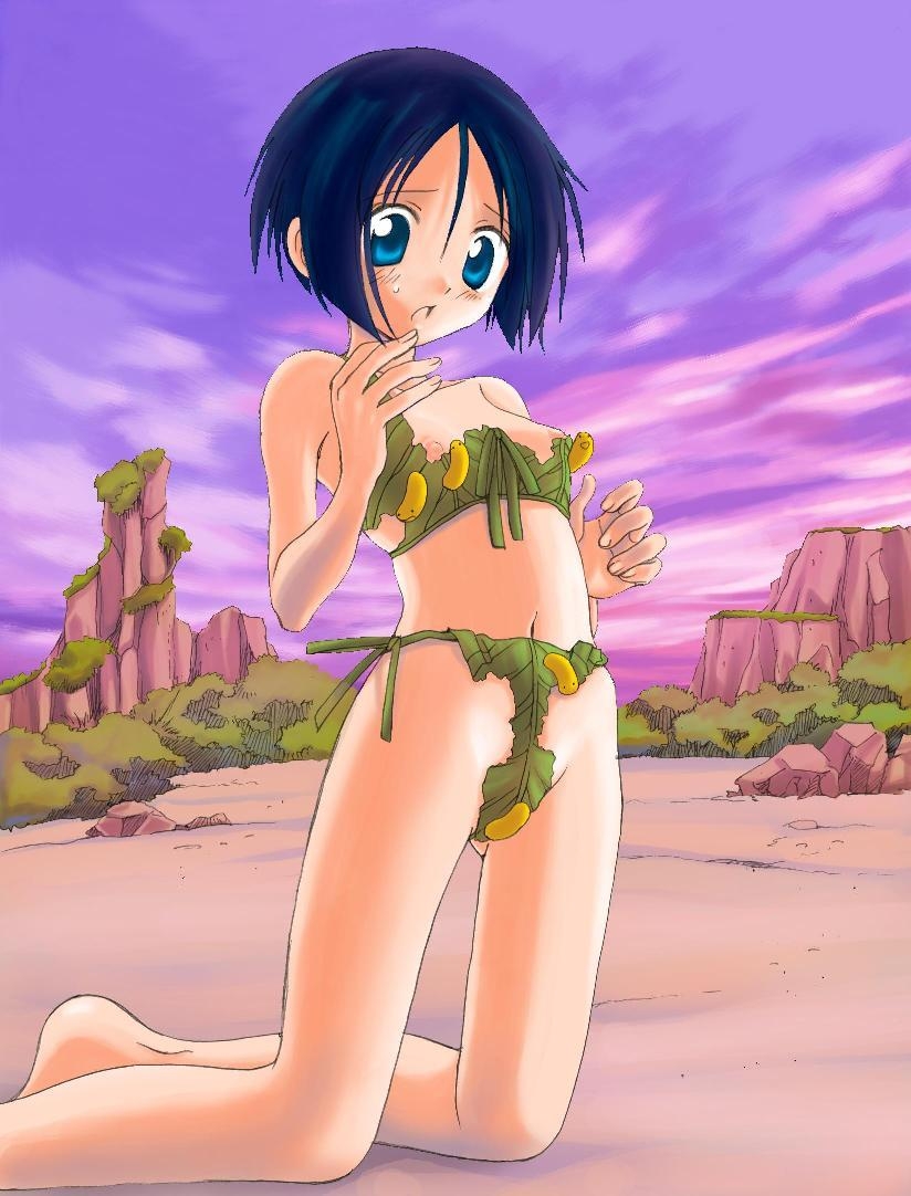 1girlbikiniblue hairbob cutbreastsbugcaterpillardissolving clothesembarrassedfemale focuskneelingleafleaf bikinilolinipple slipnipplespuffy nipplesshort hairsmall breastssolosunsetswimsuittorn clotheswardrobe malfunction