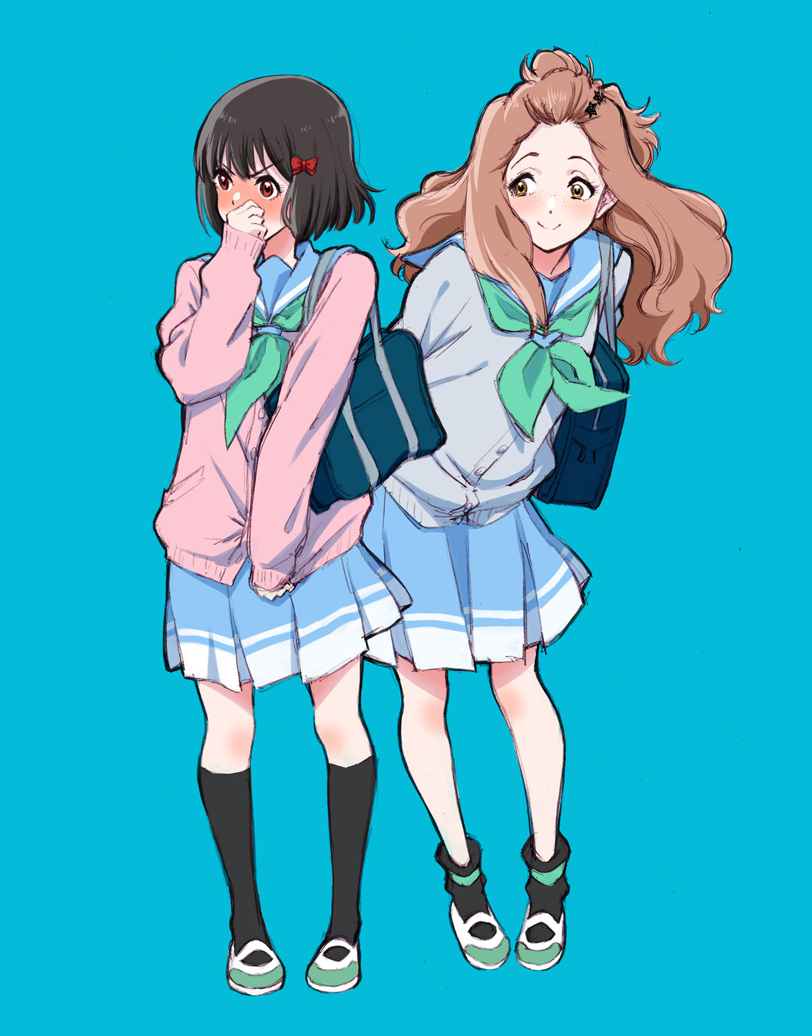 2girlsbagbangs pinned backblack hairblack socksblue backgroundblue sailor collarblue skirtblushbowbrown eyesbrown haircardiganclosed mouthcovering own mouthembarrassedfull bodyfull-face blushgreen neckerchiefhair bowhair ornamenthaircliphand over own mouthkitauji high school uniformkneehighsleaning forwardlong hairlong sleeveslooking at anothermultiple girlsneckerchiefpink cardiganpleated skirtred bowred eyesribbonsailor collarschool bagschool uniformserafukushoesshort hairsimple backgroundskirtsmilesocksstandingstar (symbol)star hair ornamentuwabakiyuri
