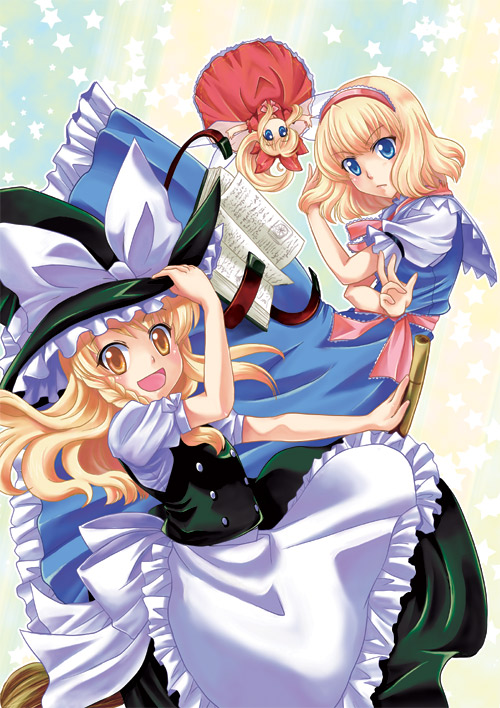 3girlsblonde hairblue eyesbookbraidbroomdressfemale focusgradient backgroundhairbandhand on headwearhatmultiple girlsribbonskirtwitchwitch hatyellow eyes