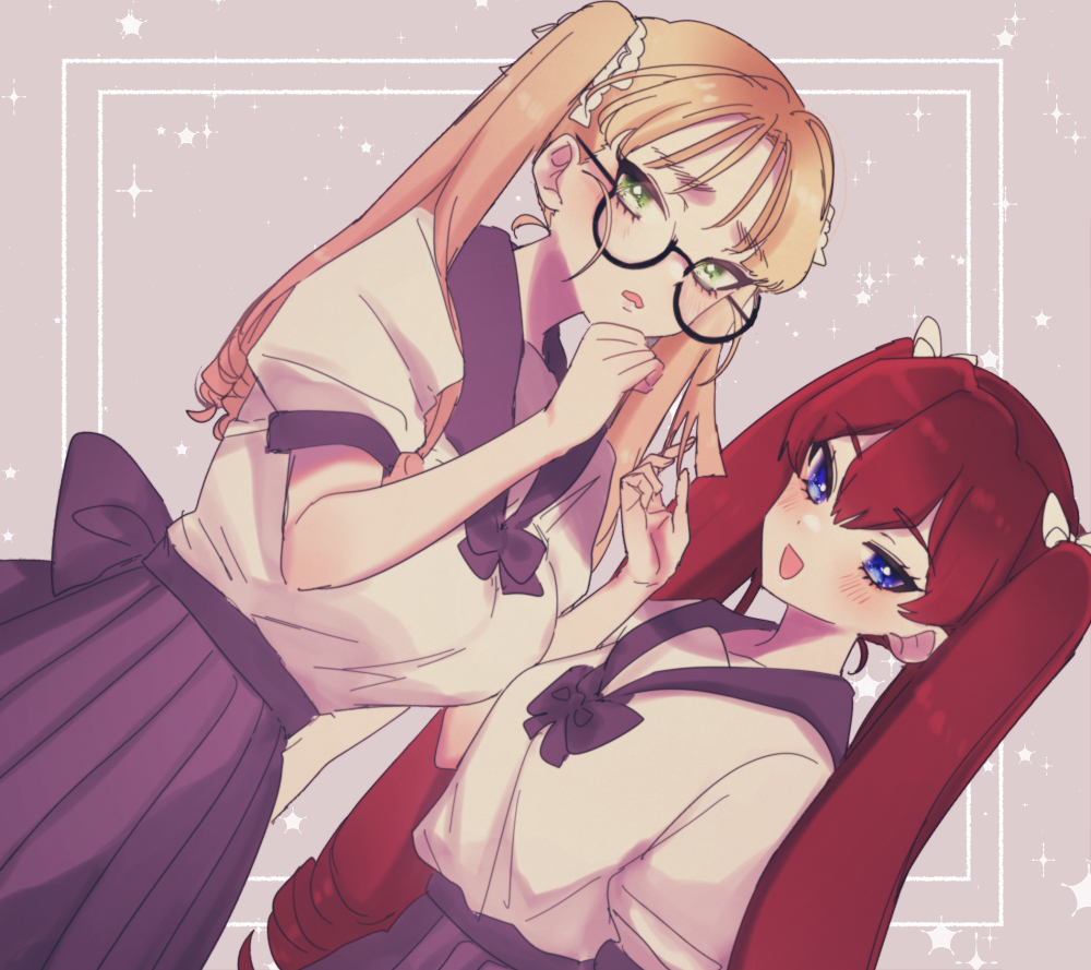 :d2girlsblonde hairblue eyesblushbreastschoppy bangscowboy shotdouble-parted bangsdutch angleglassesgreen eyesgrey backgroundhand uplarge breastslong hairlooking at viewermedium breastsmultiple girlsopen mouthpleated skirtpurple skirtred hairshirtshort sleevessimple backgroundskirtsmiletwintailswhite shirt