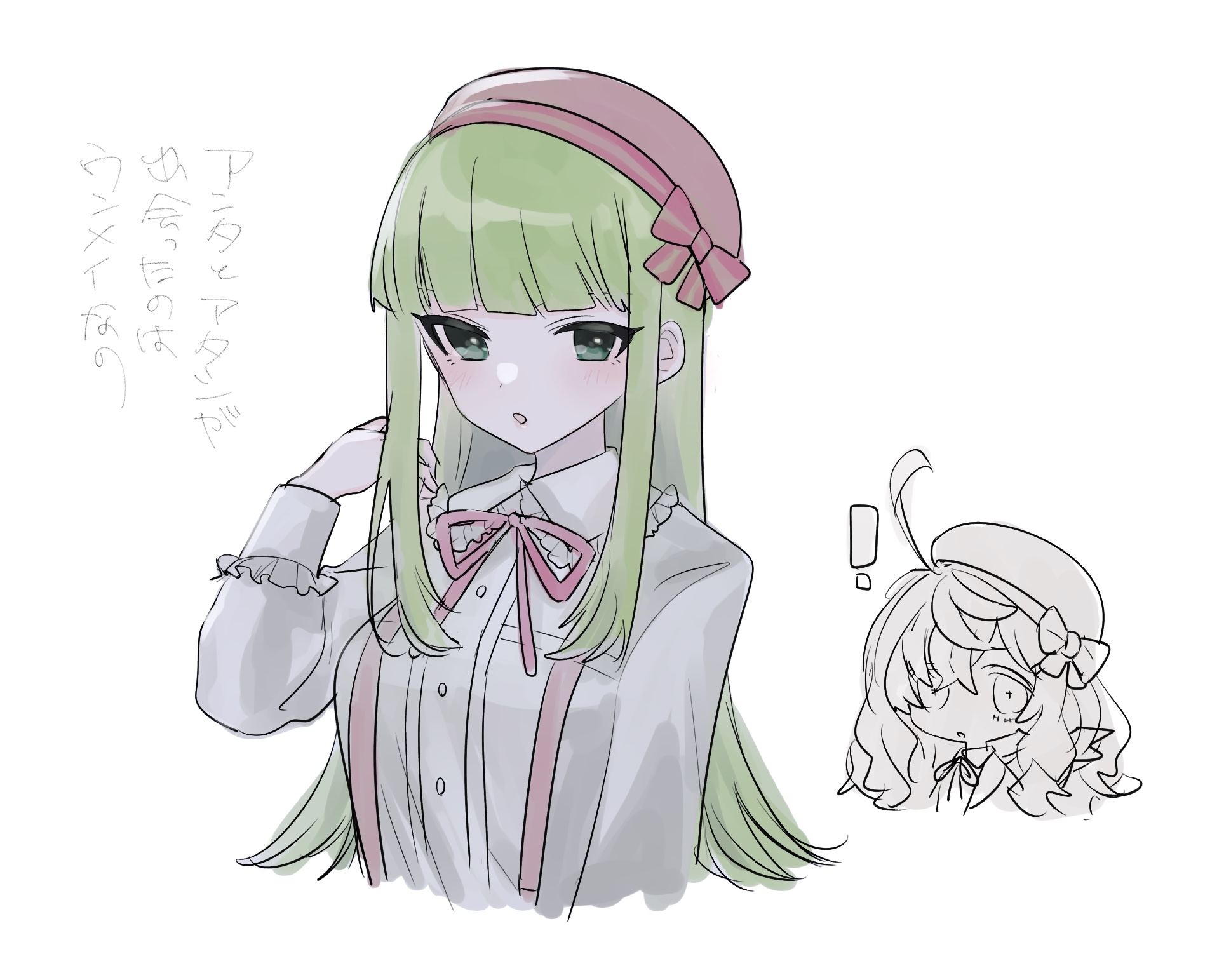 1boy2girlsberetblunt bangsbowbreastscropped torsogreen eyesgreen hairgrey shirthatlong hairlong sleeveslooking at viewermedium breastsmultiple girlsopen mouthpartially coloredpink bowpink hatpink ribbonribbonshirtsidelockssimple backgroundsketchsolo focusstraight hairwhite background