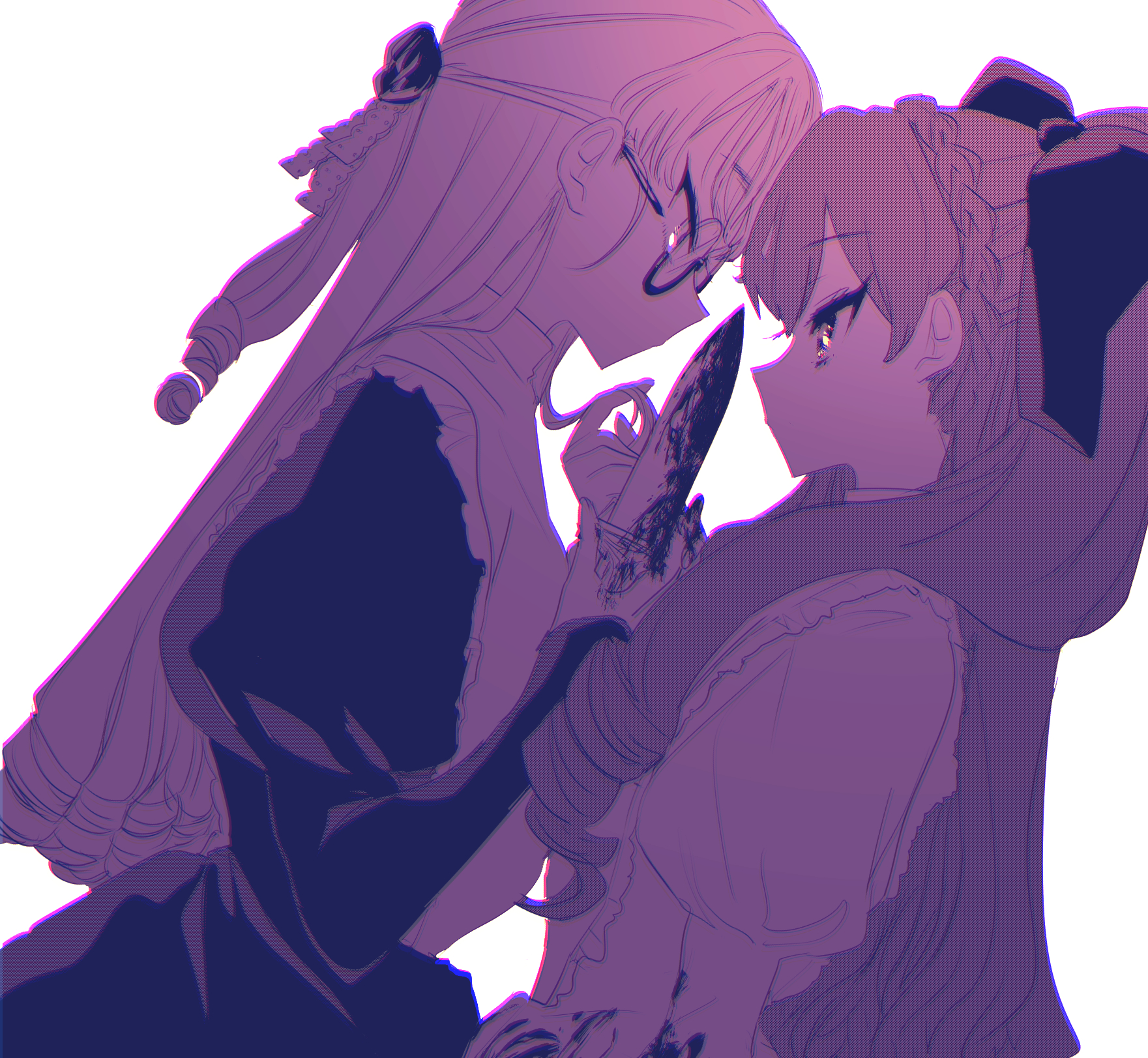 2girlsbloodbloody knifebloody weaponbraidchromatic aberrationdressdutch angleeye contactface-to-facefrom sideglassesholdingholding knifeholding weaponknifelong hairlong sleeveslooking at anothermonochromemultiple girlsno mouthprofilepurple themesimple backgroundsketchupper bodyweaponwhite background