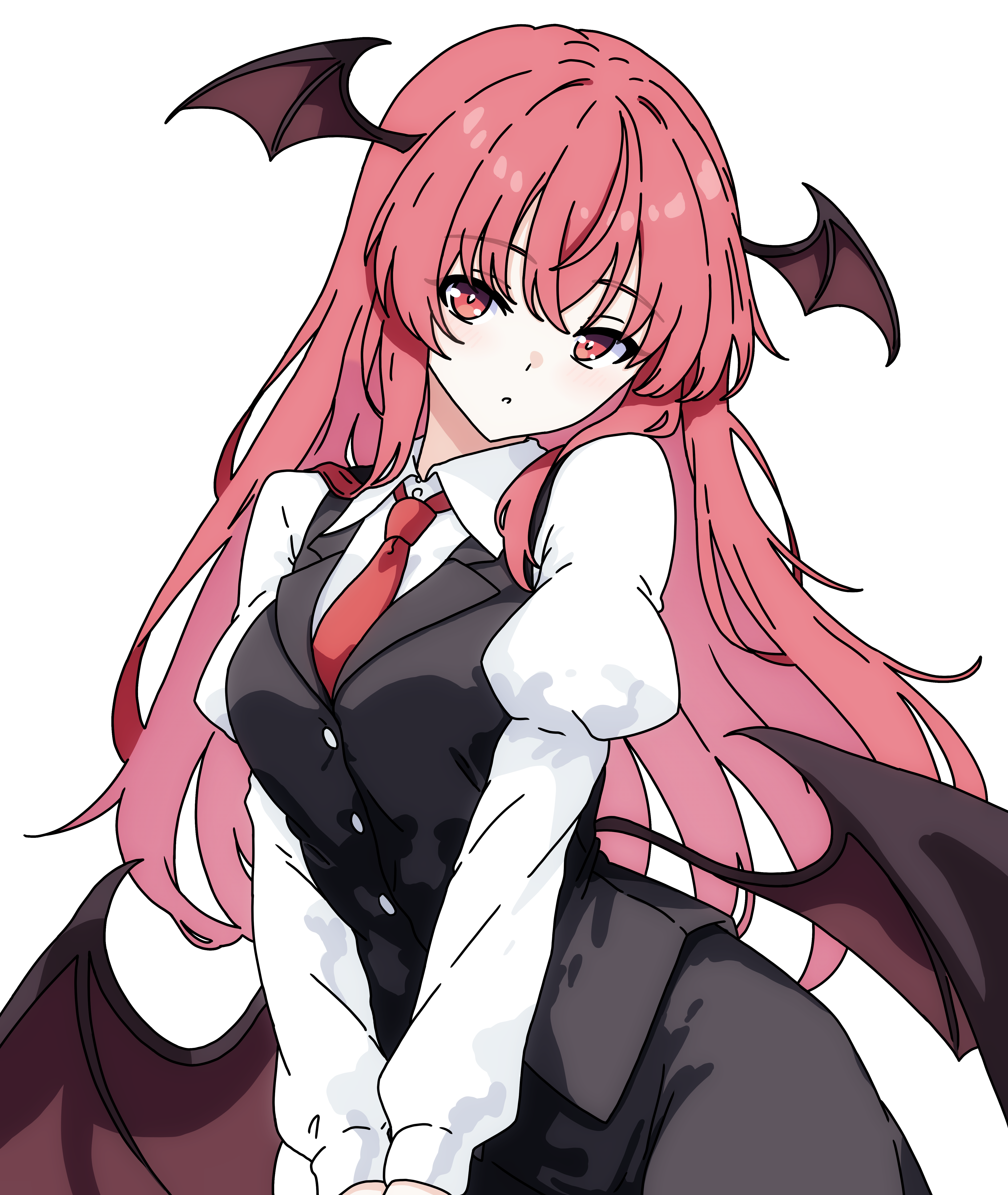 1girlblack skirtblack vestbreastscollared shirtdemon wingshead wingsjuliet sleeveslong hairlong sleeveslooking at viewernecktiepuffy sleevesred eyesred hairred necktieshirtskirtskirt setsolotransparent backgroundvery long hairvestwhite shirtwings