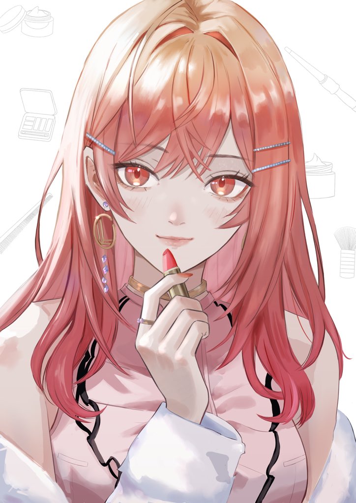 1girlbare shouldersbreastscosmeticsholdingholding lipstick tubelarge breastslipsticklipstick tubelong hairmakeuppink hairpink shirtshirtsimple backgroundsoloupper bodyvirtual youtuberwhite background