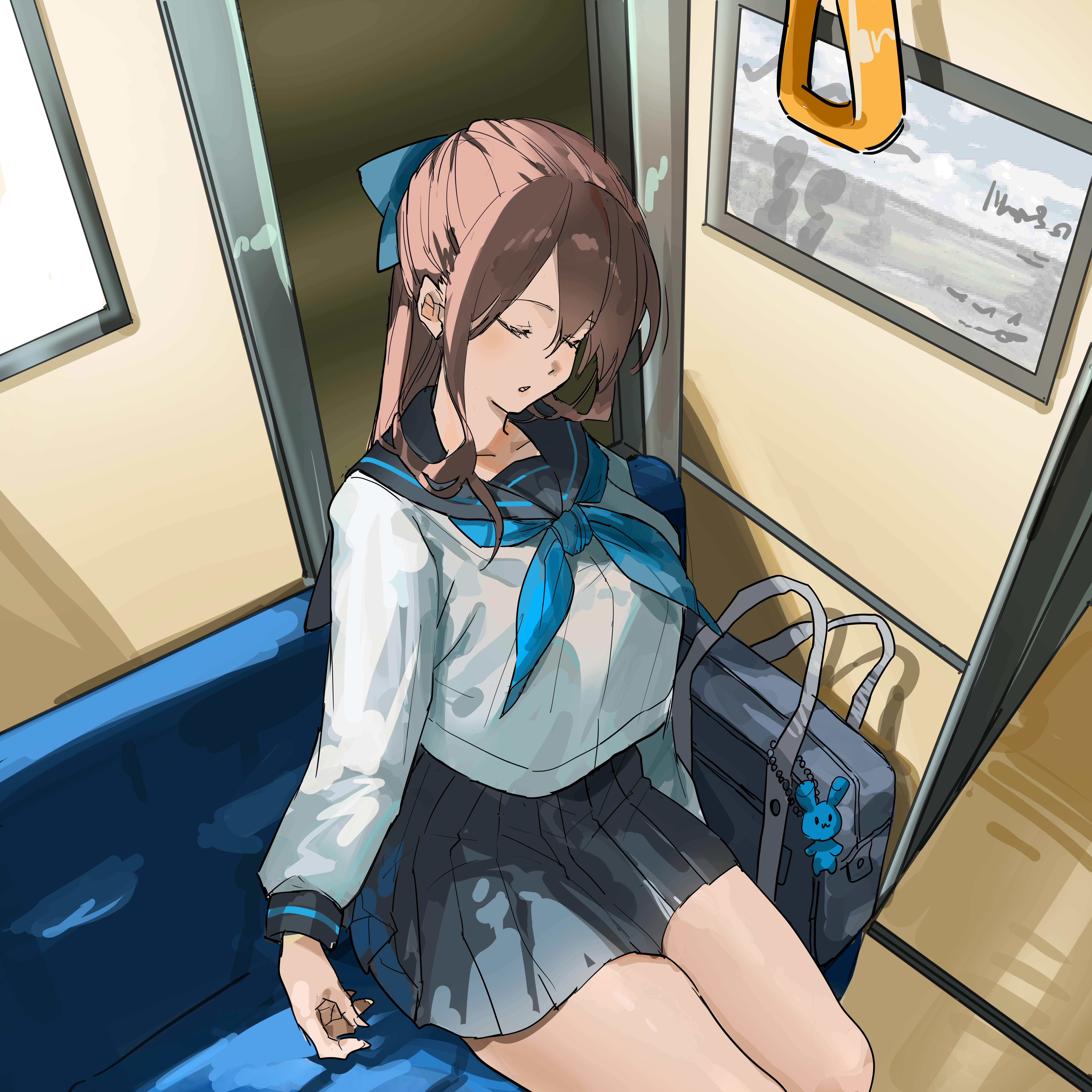 1girlbagblack sailor collarblack skirtblue neckerchiefbreastsbrown hairclosed eyescollarbonecowboy shothair between eyeshand gripindoorslarge breastslegs togetherlong sleevesminiskirtneckerchiefparted lipspicture framepleated skirtsailor collarschool bagschool uniformshirtshirt overhangsidelockssittingskirtsleepingsleeping uprightsolostuffed animalstuffed rabbitstuffed toytrain interiorwhite shirtwindow