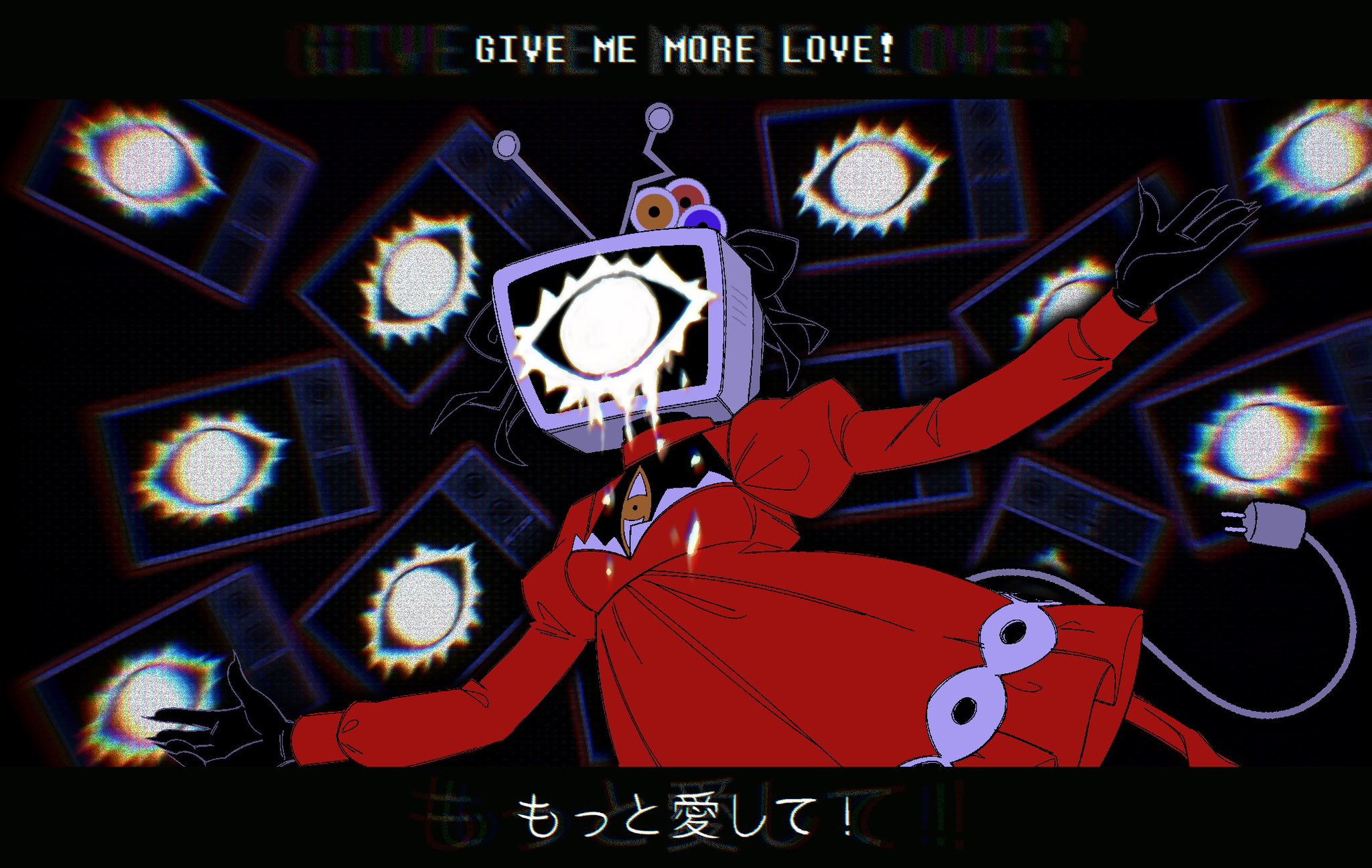 1girlblack backgroundblack ribboncablecable tailchromatic aberrationcrtdresselectric plugelectric plug tailenglish texteye symboleyeball hair ornamentfingernailsgenderswapgenderswap (mtf)hair ornamentjuliet sleevesletterboxedlong sleeveslyricsmechanical tailobject headpuffy sleevespurple tailradio antennared dressribbonsharp fingernailssolotailtelevisionwav3rr