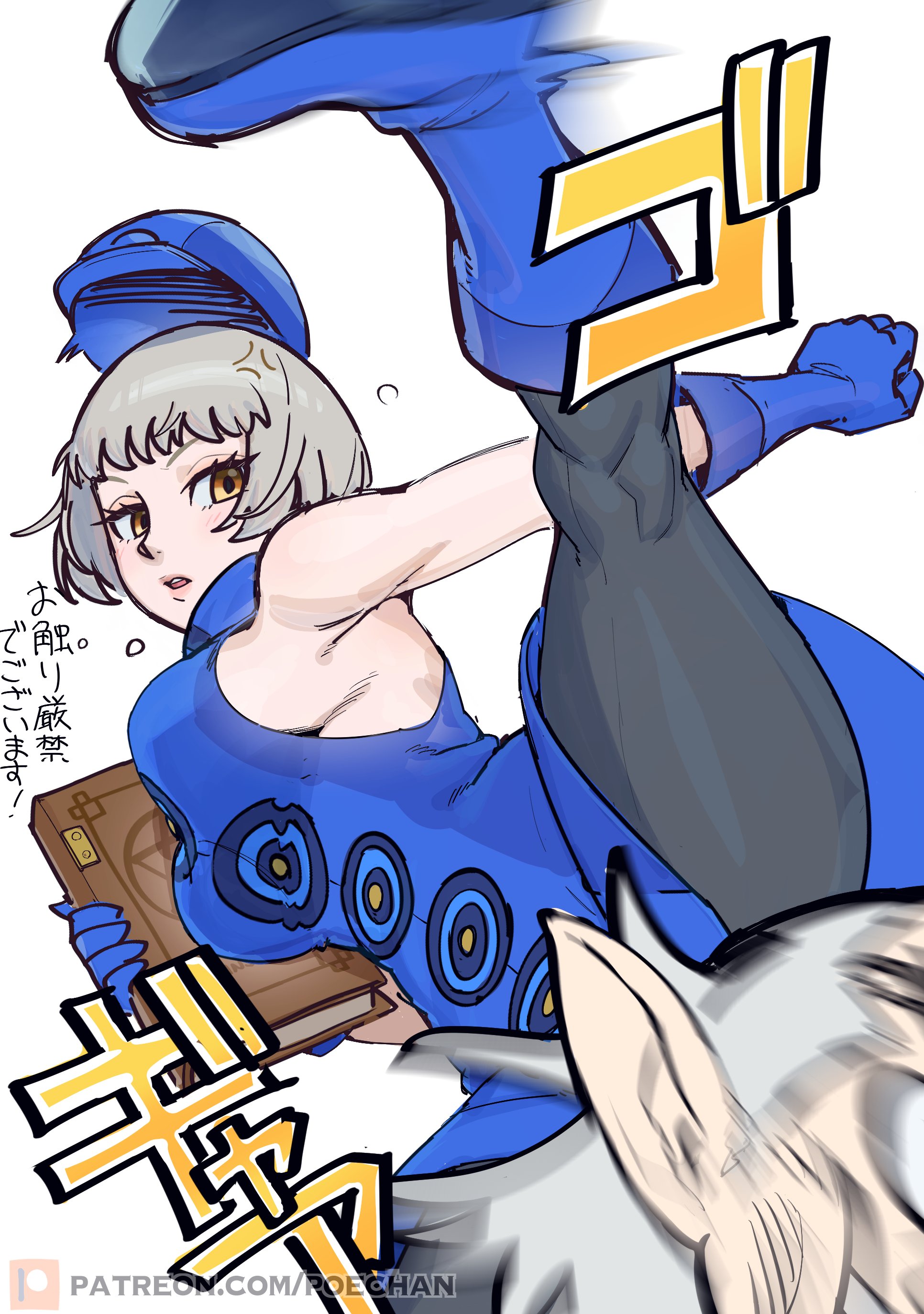 1boy1girlanger veinaxe kickbare shouldersblack pantyhoseblue bootsblue dressblue glovesblue hatblunt bangsbookbootsbreastsclenched handcollared dressdressfoot out of frameglovesgrey hairhathigh kickholdingholding bookkickinglarge breastsleg uplooking at anotherlooking to the sidemotion blurpantyhoseparted lipspatreon logopatreon usernamepink lipspointy earsshort hairsideboobsimple backgroundsleevelesssleeveless dresssound effectsstandingstanding on one legteethupper teeth onlywatermarkweb addresswhite backgroundyellow eyes