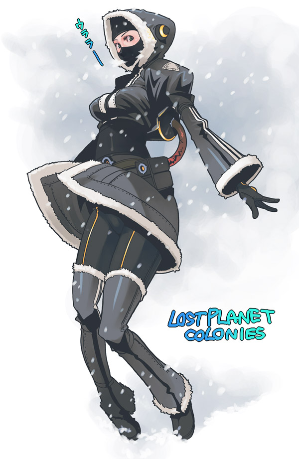 1girlbalaclavablue eyesbootsbreastscoatcoldcrossoverfur trimhoodmaskparodysnowthigh bootsthighhighstiptoeswinter clotheswinter coat