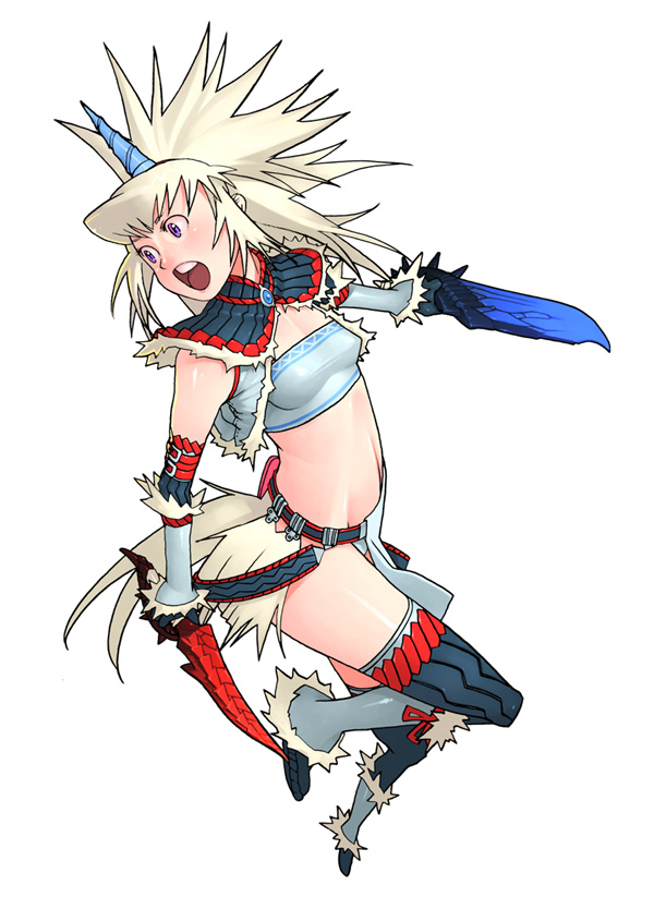 1girlbandeaublushdual wieldingelbow glovesfemale focusglovesholdinghornskirin (armor)knifelong hairmidriffpurple eyessingle hornsolostraplessthighhighstube topwhite hair