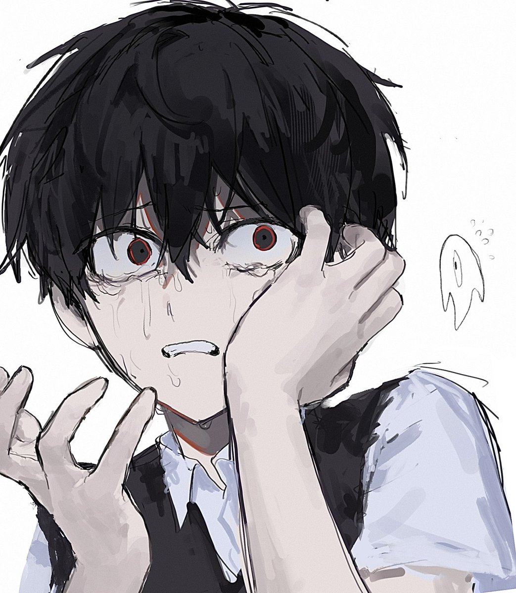 1boyantenna hairblack eyesblack hairblack sweater vestclenched teethcollared shirtcryingcrying with eyes opendouble-parted bangsfingernailsflying sweatdropshair behind earhair between eyeshand on own cheekhand on own facehands uplooking upmale focusmulticolored eyesofficial alternate eye colorportraitraised inner eyebrowsred eyesshirtshort hairshort sleevessimple backgroundsolosweater vesttearsteethtwo-tone eyesvery short hairwhite backgroundwhite shirtwide-eyed