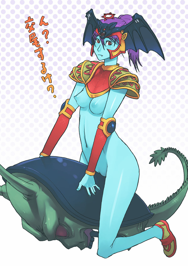 1girlblue skinbreastscolored skinfangfemale focushead wingshelmhelmetmonster girlnudeponytailpurple hairred eyessolowings