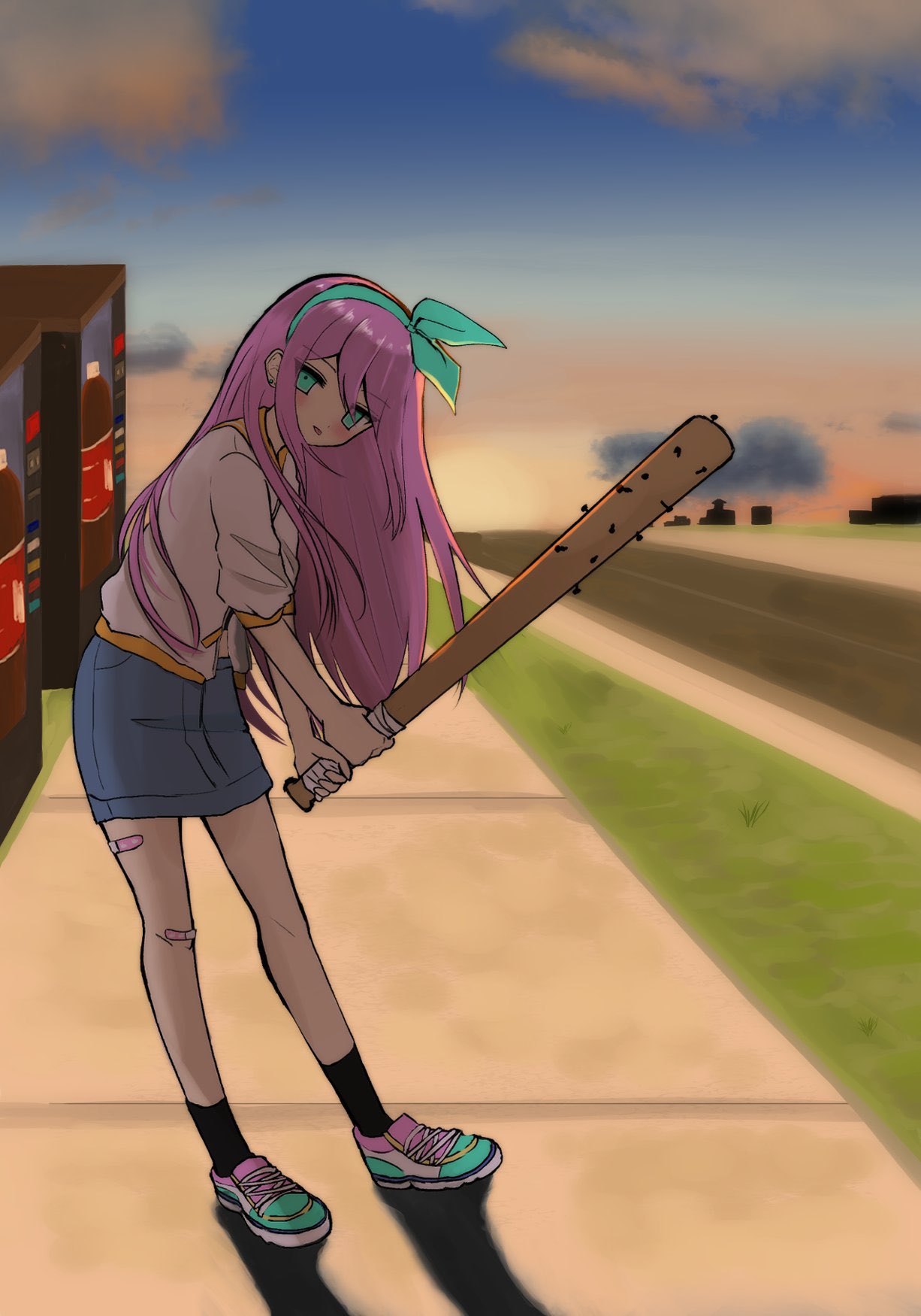 1girlankle socksaqua eyesaqua hairbandbacklightingbandaidbandaid on kneebandaid on legbandaid on thighbaseball batblack socksblue skirtblue skyblushbow hairbandbuildingclouddenimdenim skirtdouble-parted bangsearringsfull bodygradient skygrasshair between eyeshairbandholdingholding baseball batin-universe locationjacketjewelryleaning forwardlong hairlooking at viewerminiskirtnail (hardware)nail batorange skyoutdoorspink hairroadshadowshoessidewalkskirtskysneakerssockssolostandingstud earringssunsetthree-quarter sleevestonguetongue outtsurimevending machinevery long hairwhite jacketwhite shoes