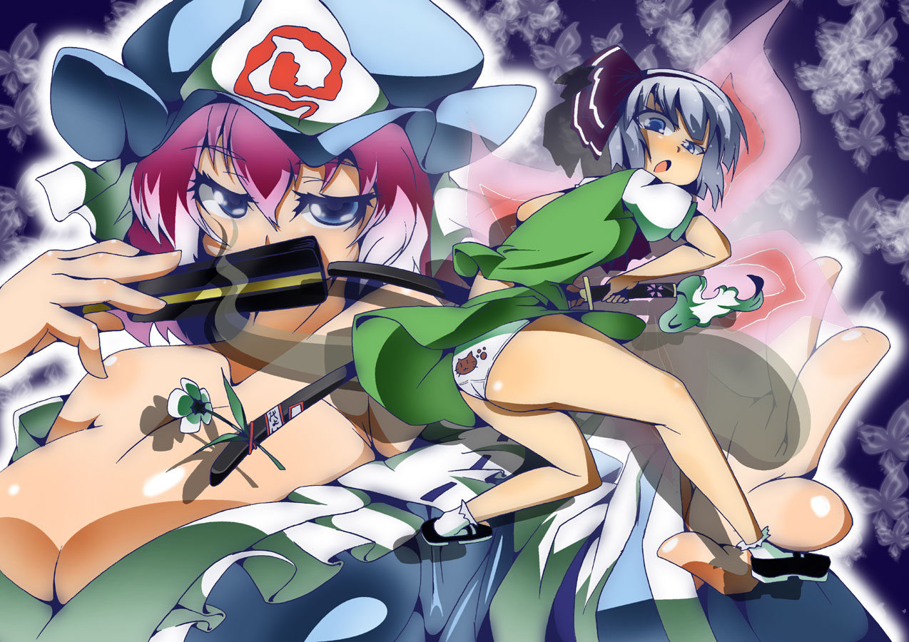 muhyowo, gene (god hand), olivia (god hand), capcom, god hand, 1boy, 1girl, axe, belt, blood, blue eyes, blush, boots, brown hair, choker, guro, hatchet, hatchet (axe), jacket, jewelry, middle finger, necklace, skirt, warrior, weapon, wristband
