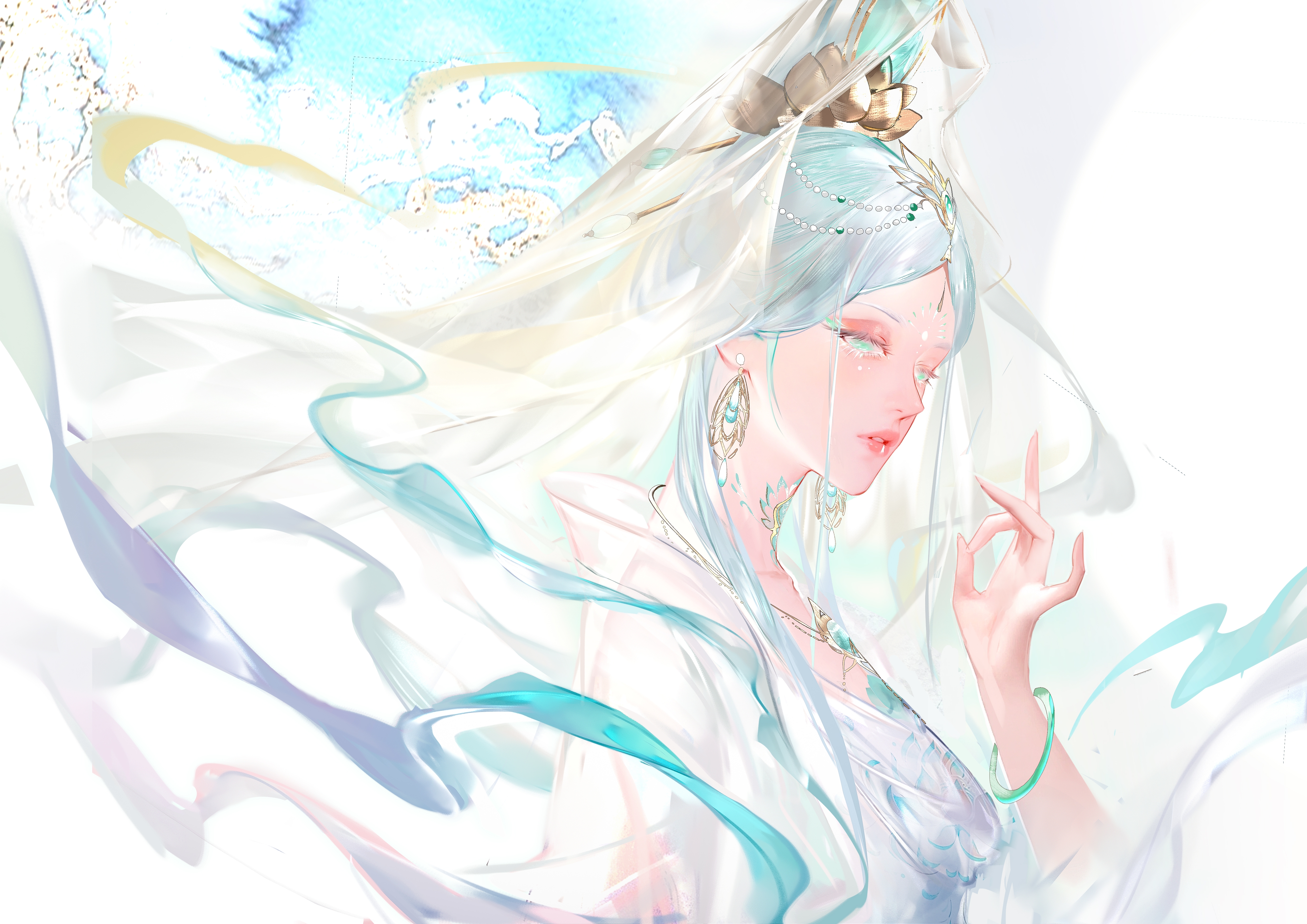 1girlabstract backgroundblue eyesblue haircollarbonedressearringseyeshadowfacial hairfacial markforeheadforehead jewelforehead markfrom sidegreen shawlhair ornamenthairpinhalf-closed eyesheadpiecejade braceletjewelrylipslotus hair ornamentmakeupmudramultiple hairpinsparted bangsparted lipspearl hair ornamentred eyeshadowsee-through clothessee-through veilshawlsoloupper bodyveilwhite dress