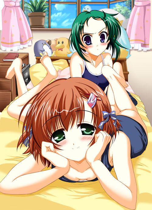 2girlsangrybarefootblushbowdiarydownblousefeetforeheadhair ornamentmultiple girlsone-piece swimsuitschool swimsuitstuffed animalstuffed toyswimsuit