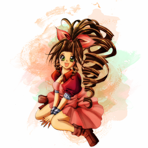 1990s (style)1girlbootsbowbrown haircropped jacketdressdrill hairfemale focusgreen eyeshair bowpink bowpink dressponytailretro artstylesmilesolo
