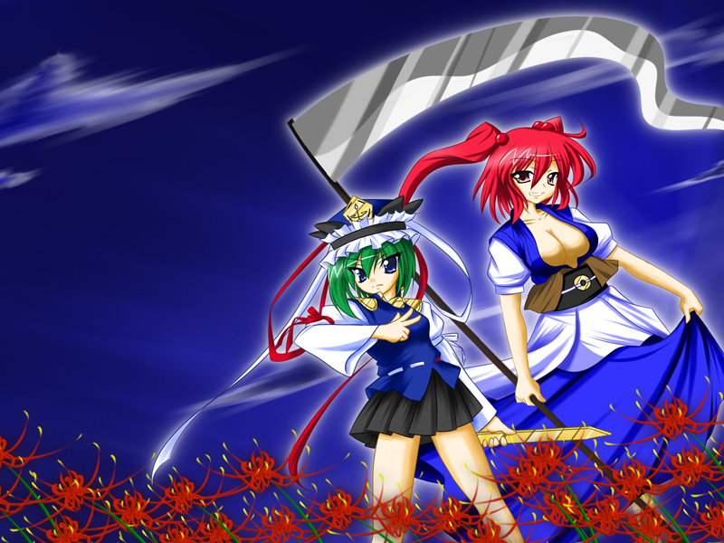 2girlsblue eyesbreastscleavagefemale focusflowergreen eyeslarge breastsmultiple girlsred flowerrod of remorsescythespider lily