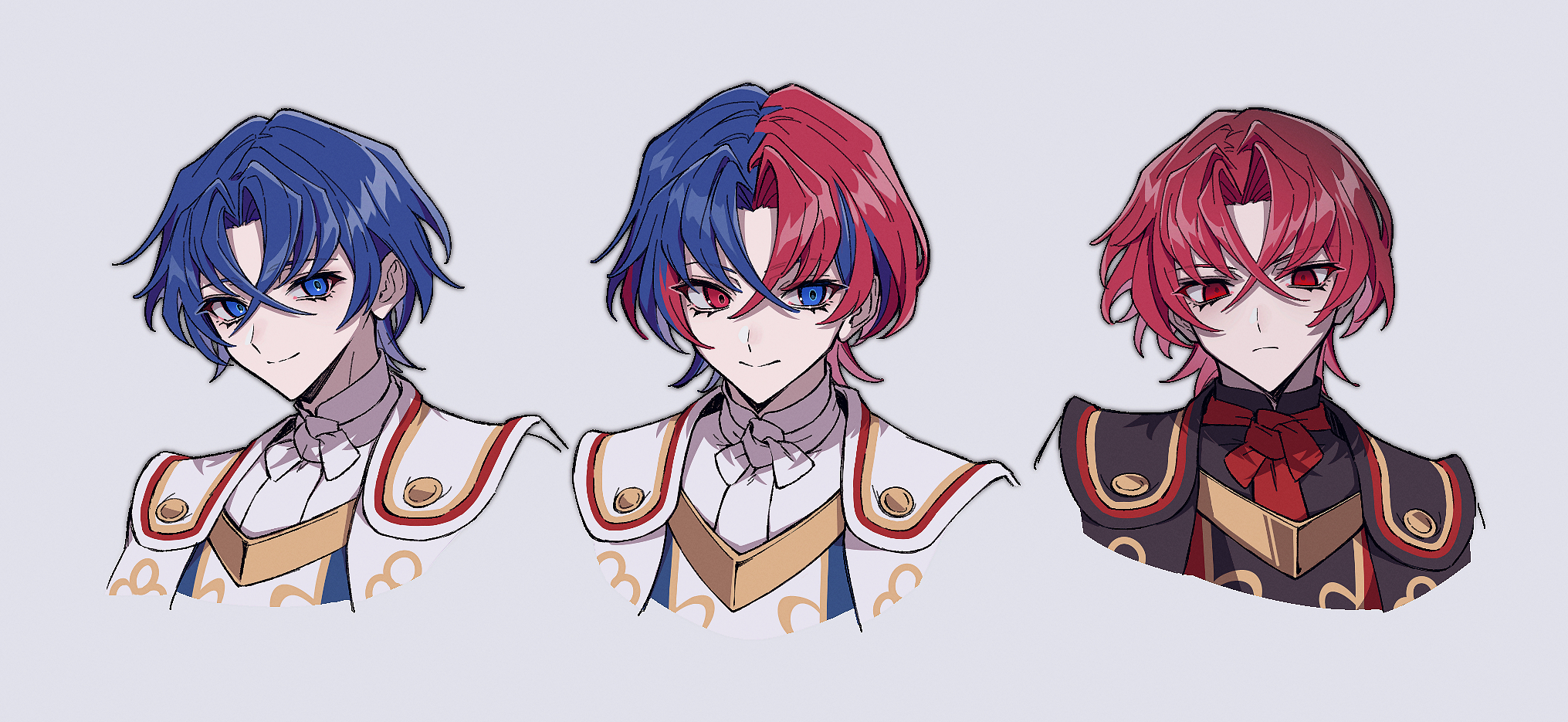 3boysblue eyesblue haircrossed bangsdark personahair between eyesheterochromialight personalooking at viewermale focusmulticolored hairmultiple boysofficial alternate hair colorprincered eyesred hairshort hairsmilesplit-color hairtwo-tone hair