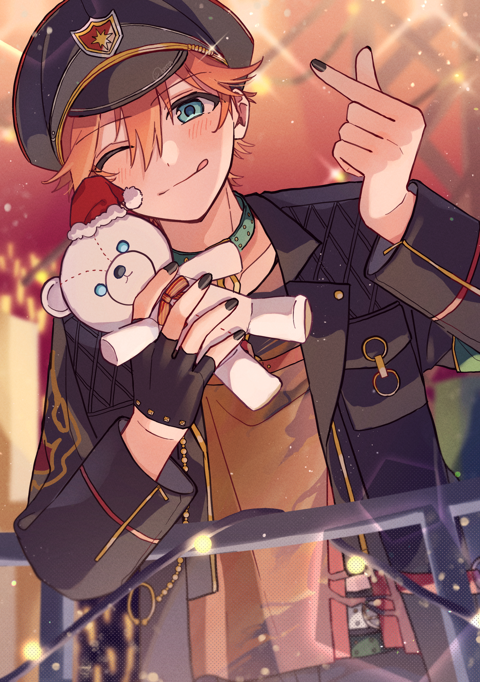 1boyagainst railingblack hairblack jacketblack nailsblue eyeschokerclosed mouthemblemfinger heartgreen chokerhair between eyeshatholdingholding stuffed toyjacketlooking at viewermale focusofficial alternate costumeopen clothesopen jacketorange hairpeaked caprailingsanta hatshort hairsmilesolostuffed animalstuffed toyteddy beartonguetongue out