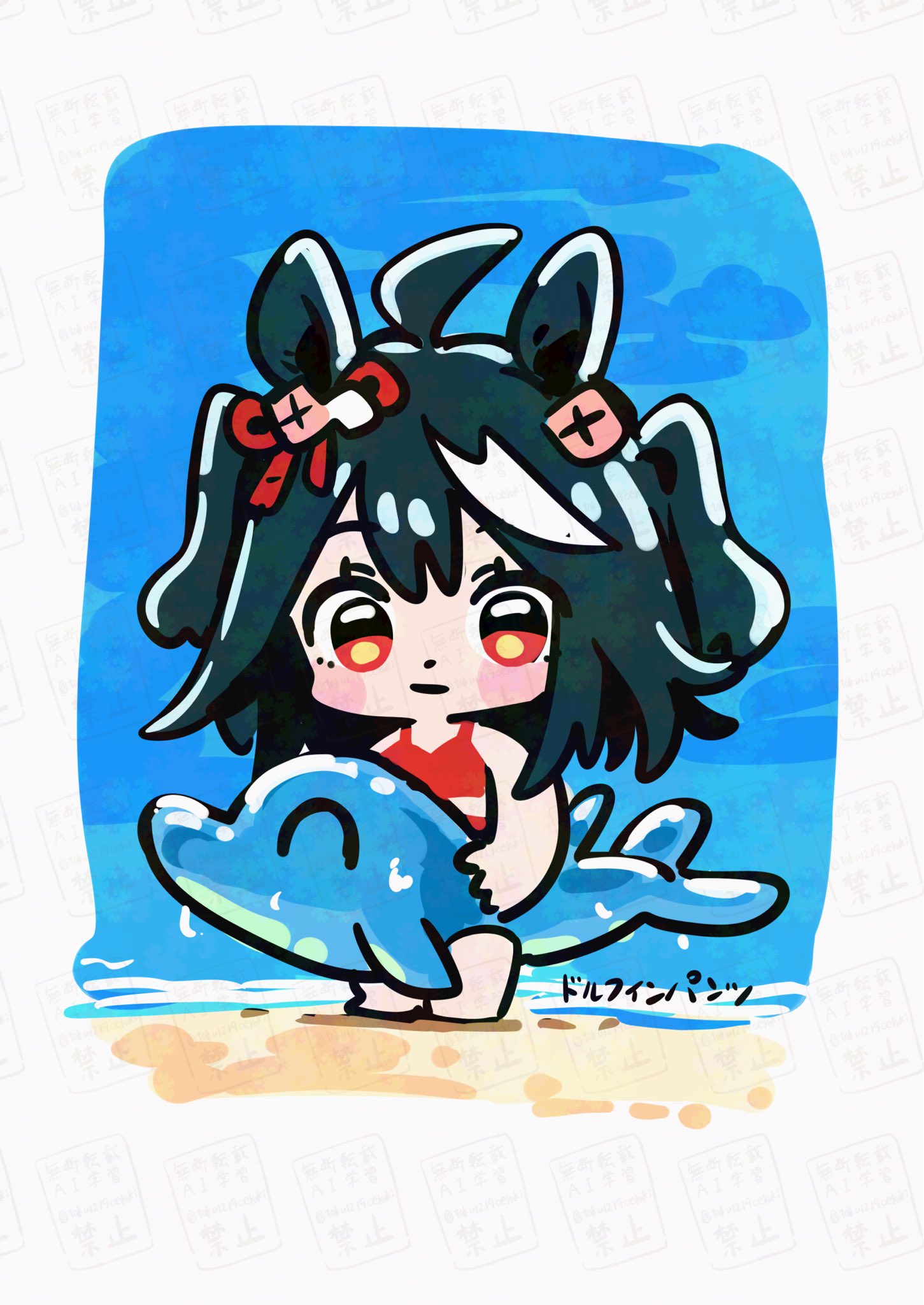 1girlahogeanimal earsblack hairblushbowchibidolphinear ornamentear ribbonhair between eyeshorse earshorse girlhorse taillooking at viewermulticolored hairred eyesropeshimenawashort hairsmilesolostreaked hairswimsuittailwhite hair