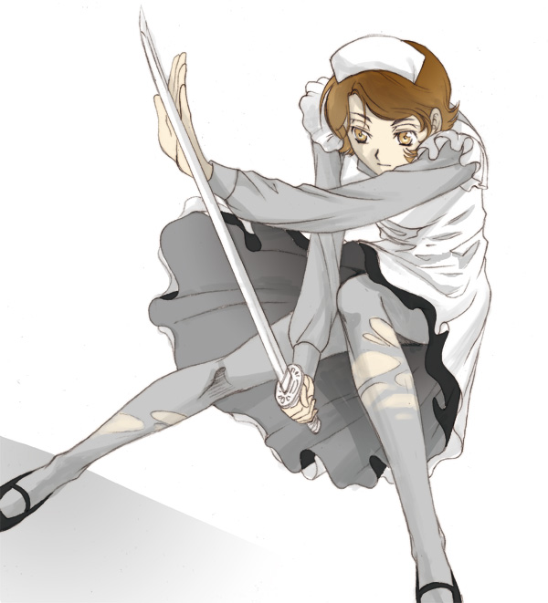 prima (artist), asahina mikuru, kyon, nagato yuki, suzumiya haruhi, suzumiya haruhi no yuuutsu, 00s, 1boy, 3girls, gun, handgun, monochrome, multiple girls, pistol, sepia, weapon