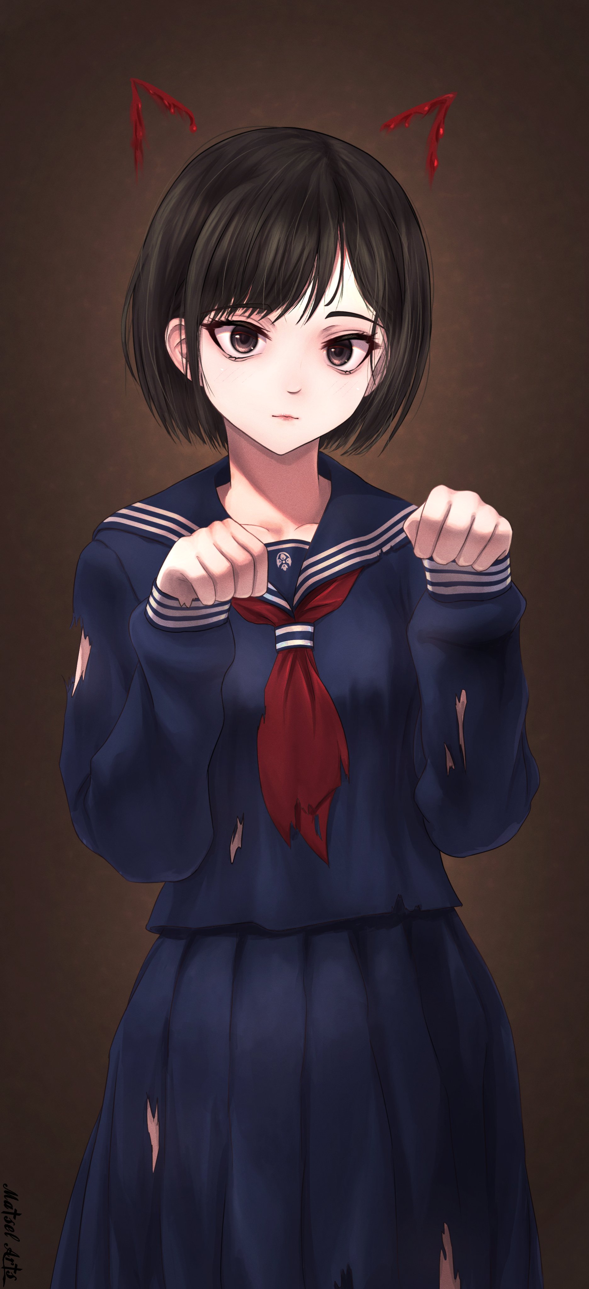 1girlblack hairblack skirtbrown eyesgradient backgroundlooking at viewerpaw posepleated skirtschool uniformserafukushort hairskirttorn clothes