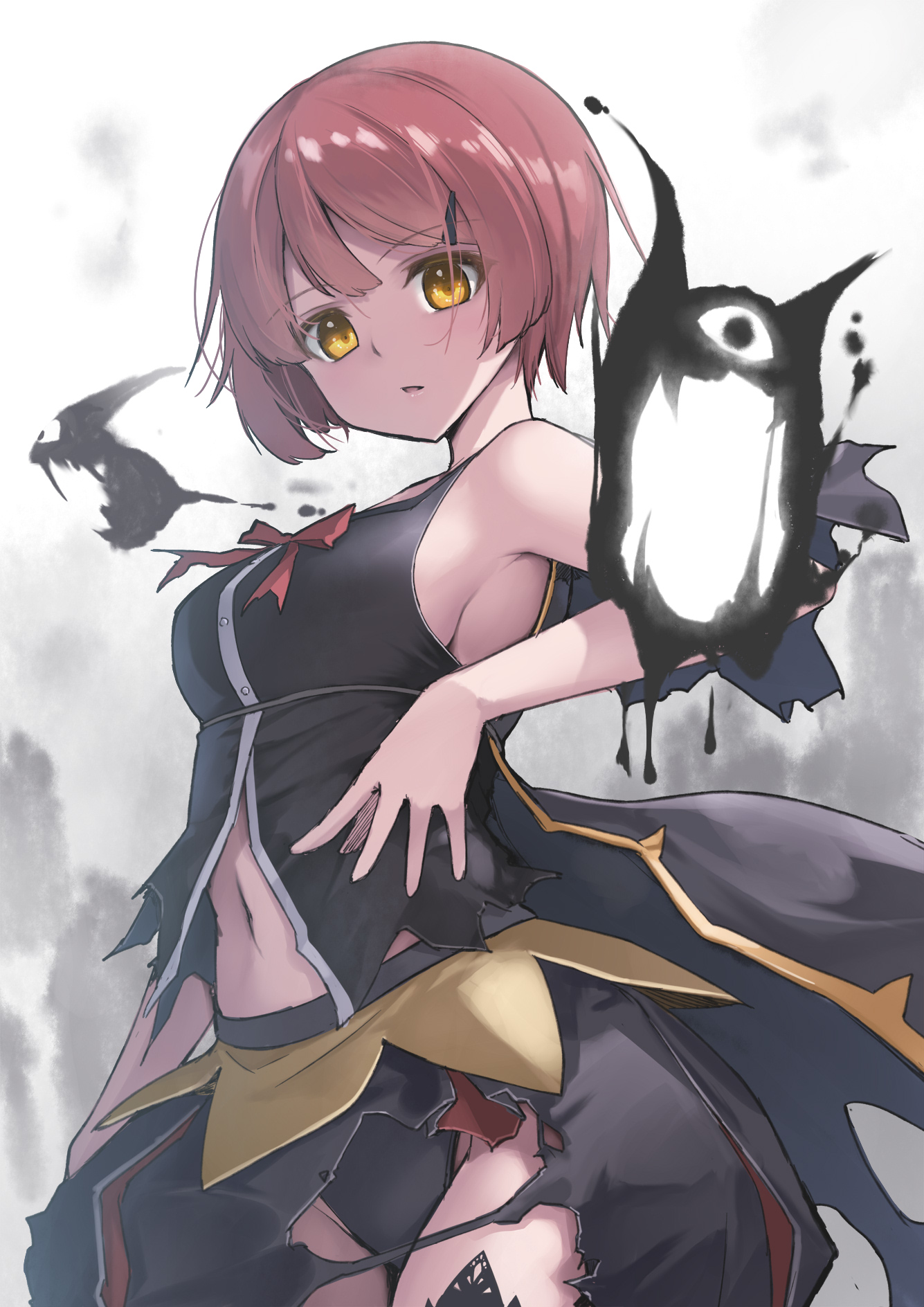 1girlarmpit creasebare shouldersblack coatblack pantiesblack shirtblack skirtbreastsbrown eyesbrown hairbubble skirtcoatcowboy shotdark personahair between eyeshair ornamenthaircliplarge breastslooking at viewernavelpantiesparted lipspartially unbuttonedred ribbonribbonshirtshort hairsideboobsidelocksskirtsleevelesssleeveless shirtsolostandingtorn clothestorn skirtunderwear