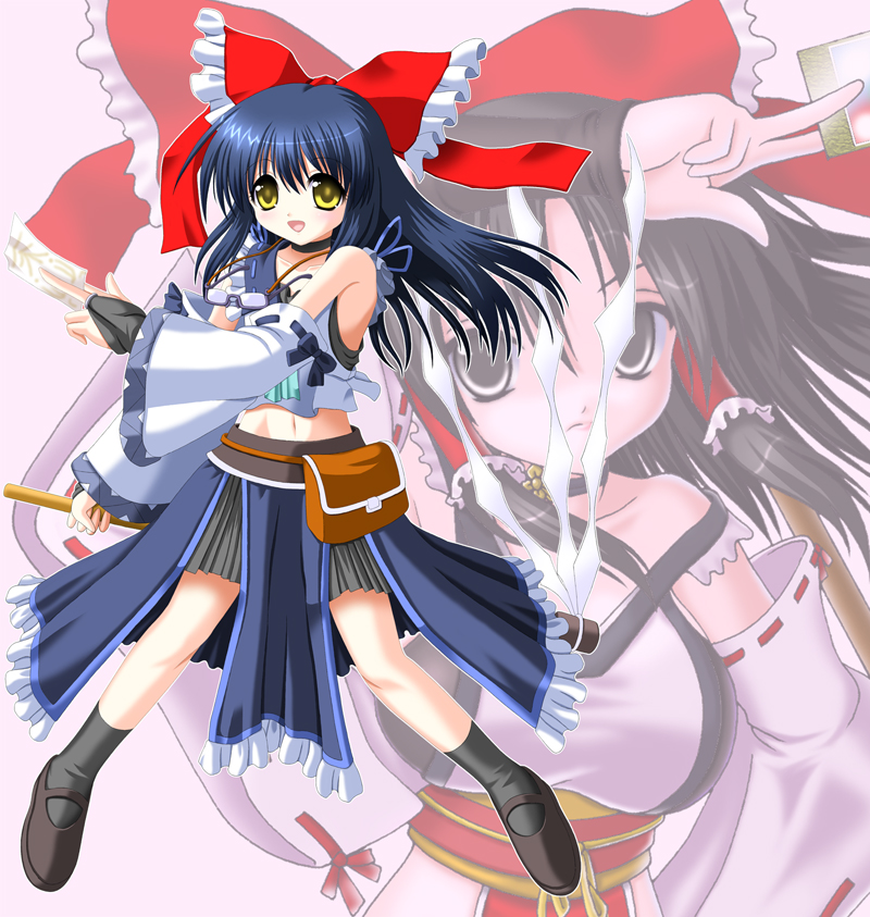1girlbagbetween fingersblack hairbowbreastschokerdetached sleevesfemale focusglassesgoheihair bowhair tubesholdingif they matedjapanese clotheslarge breastslooking at viewermidriffmikooonusaopen mouthpelvic curtainribbonshirtskirtsleevelesssleeveless shirtsmilesolospell cardwide sleevesyellow eyes