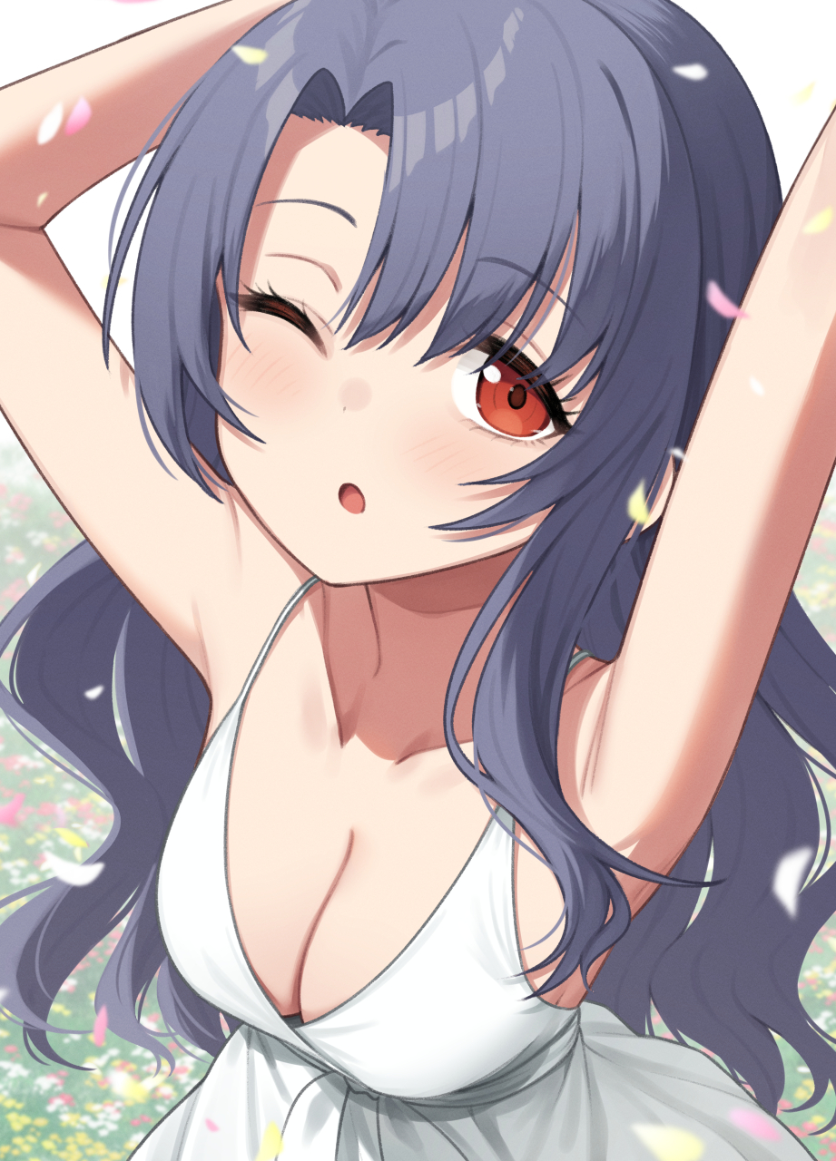 homare (fool's art), katsuragi misato, gainax, neon genesis evangelion, 1girl, 3boys, breasts, censored, collarbone, double handjob, fingernails, gangbang, group sex, half-closed eyes, handjob, indoors, large breasts, long fingernails, long hair, looking at viewer, mosaic censoring, multiple boys, nail (hardware), nail polish, neck, nipples, open mouth, parted bangs, penis, red nails, sex, smile, solo focus, straight hair