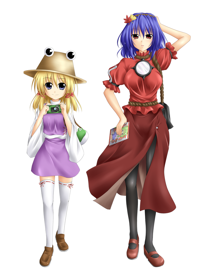 2girlsblonde haircamerafemale focushair ornamenthatleaf hair ornamentmultiple girlspantyhosepurple hairropeshort hairthighhighszettai ryouiki