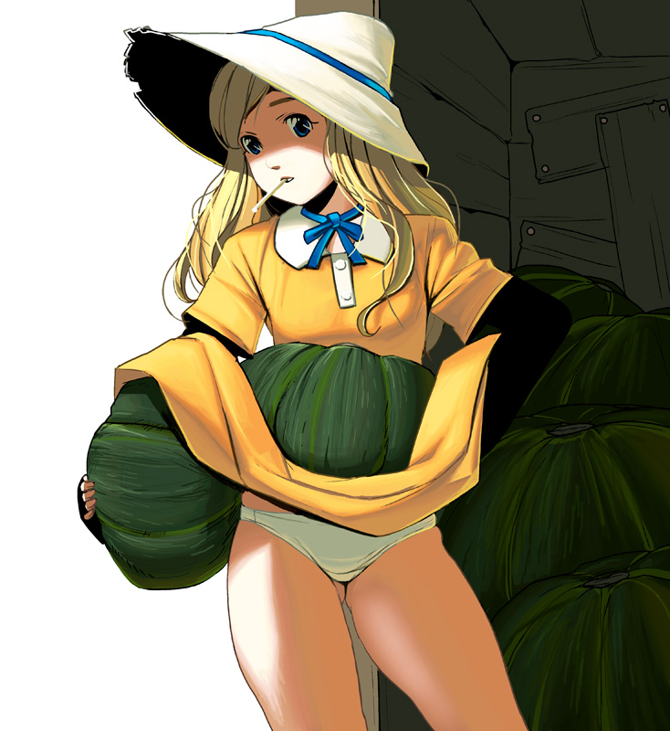 1girlblonde hairblue eyesclothes liftcowboy shotfemale focushatlong hairmouth holdpantiespumpkinskirtskirt liftsolounderwearupskirt