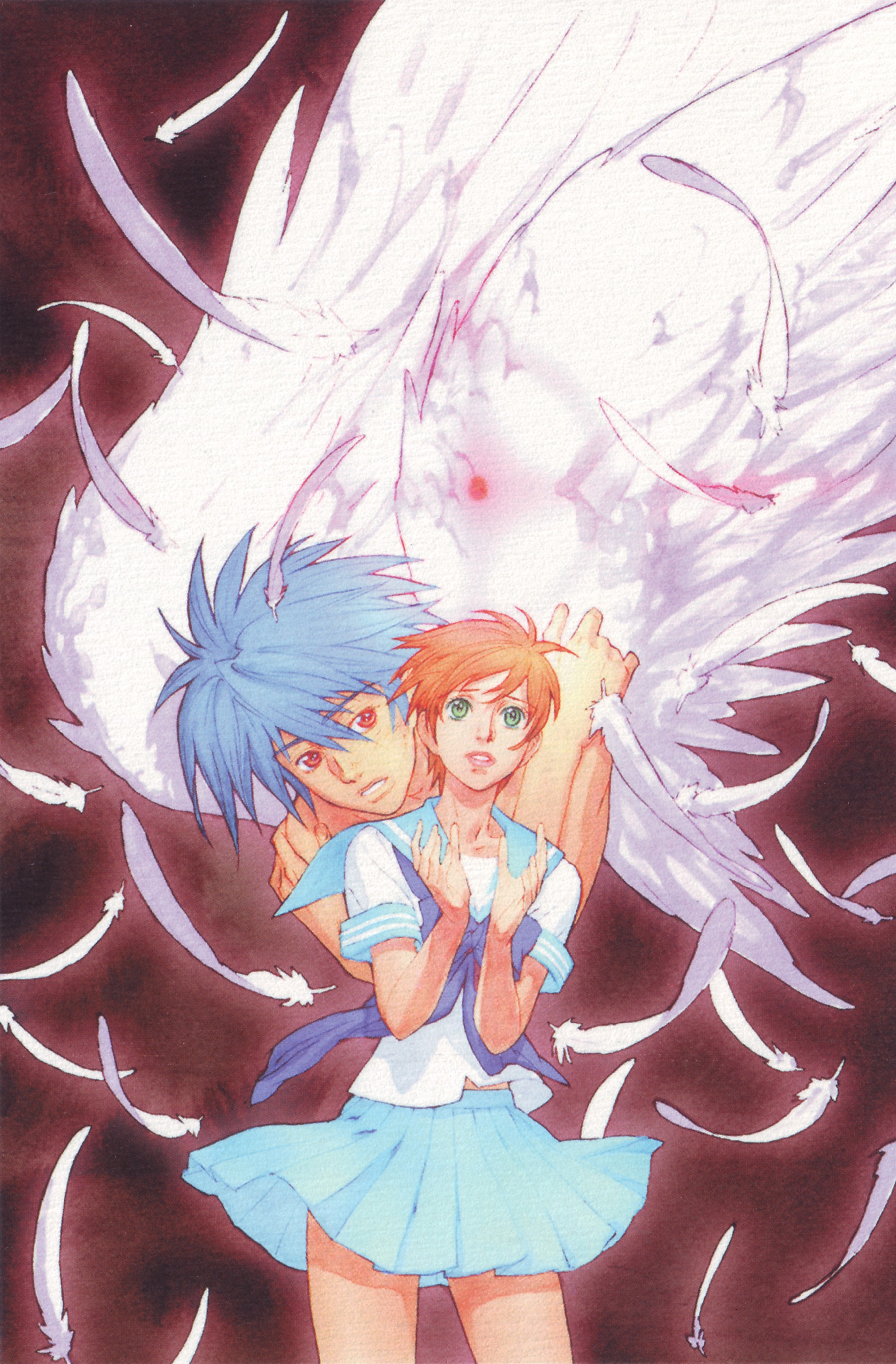 1990s (style)1boy1girlblue hairfeathersgreen eyesred backgroundred eyesretro artstyleschool uniformserafukuwings