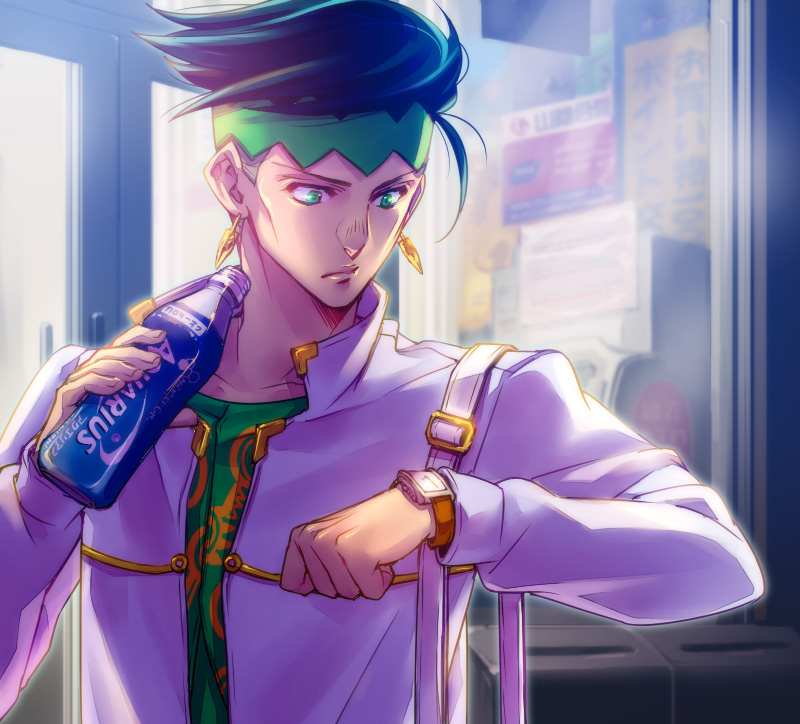 1boyblue hairbottleconvenience storedrinkearringsgreen eyesheadbandjacketjewelrymale focusnightshopsolowatchwristwatch