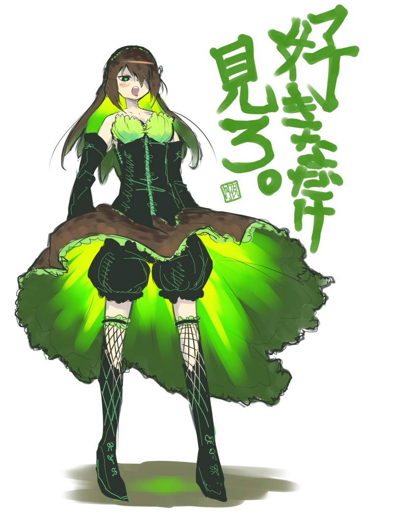 1girlbare shouldersbloomersbootsbrown hairclothes liftdetached sleevesdressfemale focusgreen eyesgreen hairhair over one eyelong hairmatching hair/eyesmushroompersonificationskirtskirt liftsolothighhighsunderwear