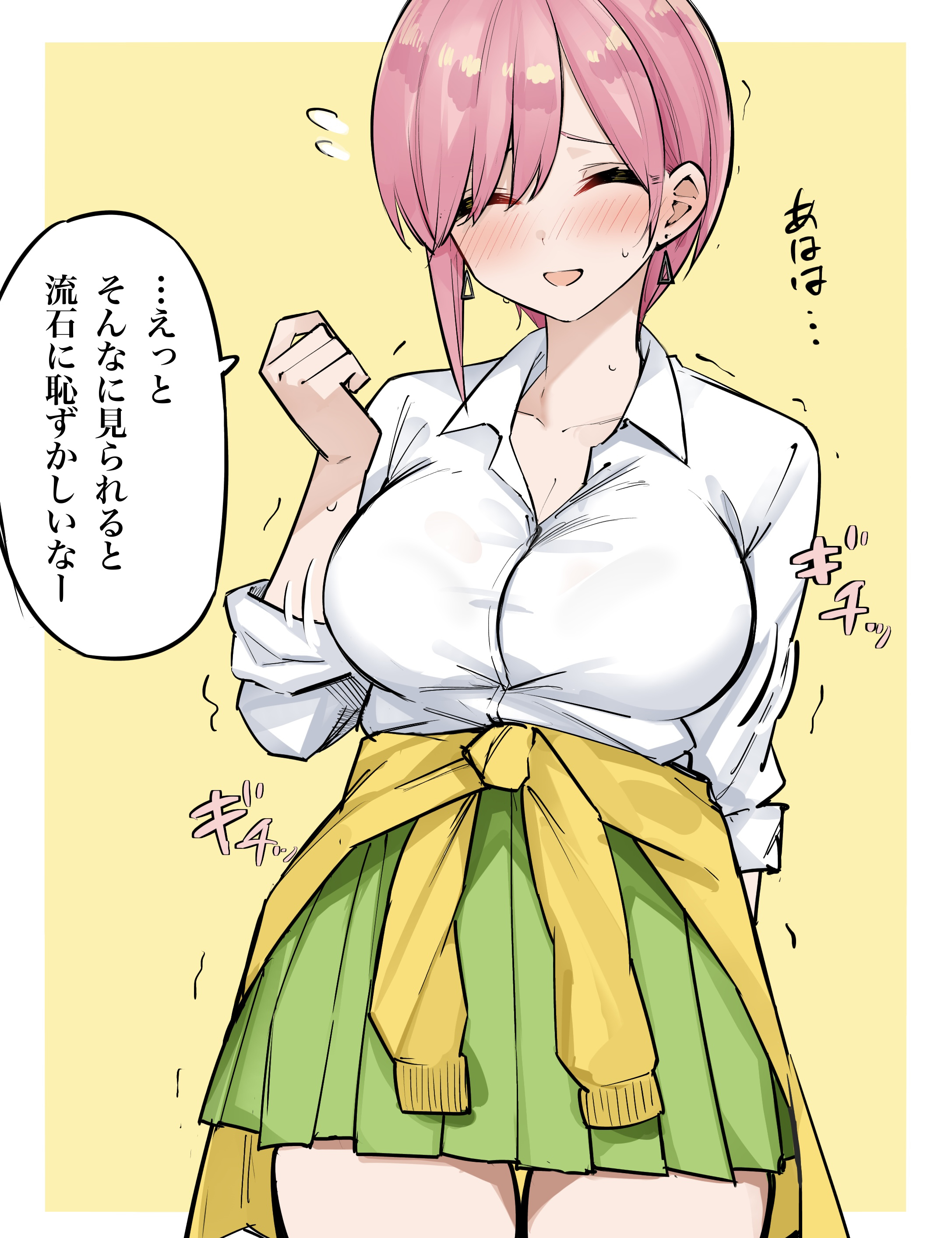1girlarm behind backblushborderbreastscardigancardigan around waistcleavageclosed eyesclothes around waistcollarbonecollared shirtcowboy shotearringsfacing viewerflying sweatdropsgreen skirthand upjewelrylarge breastsopen mouthoutside borderpink hairpleated skirtschool uniformshirtshirt tucked inshort hairskirtsmilesolosound effectswhite borderwhite shirtyellow backgroundyellow cardigan
