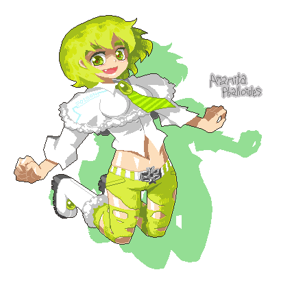 1girlbeltbootsfangfemale focusfull bodygreen eyesgreen hairmatching hair/eyesmidriffmushroomnecktiepersonificationpixel artshort hairsmilesolotorn clothestransparent background